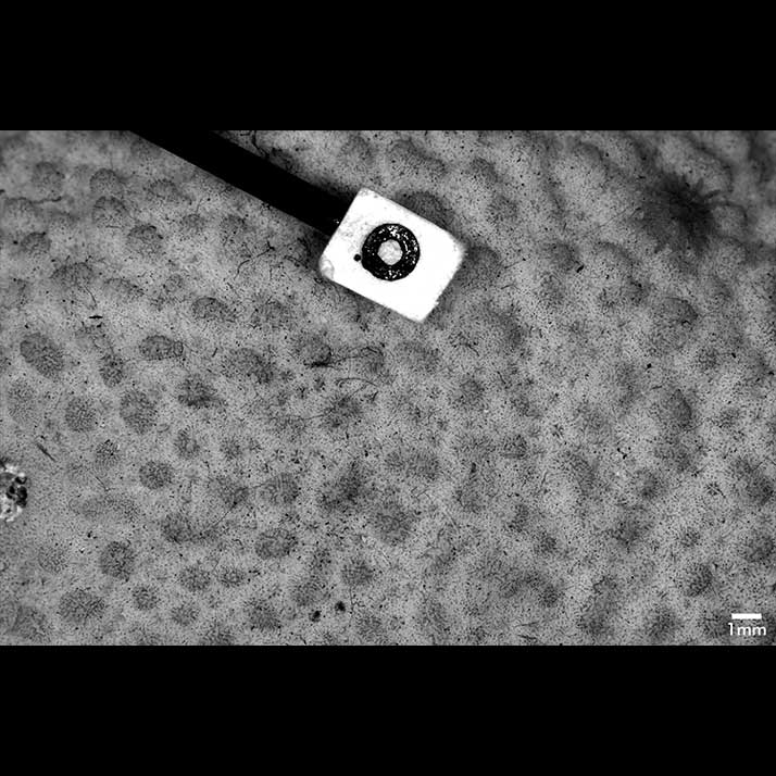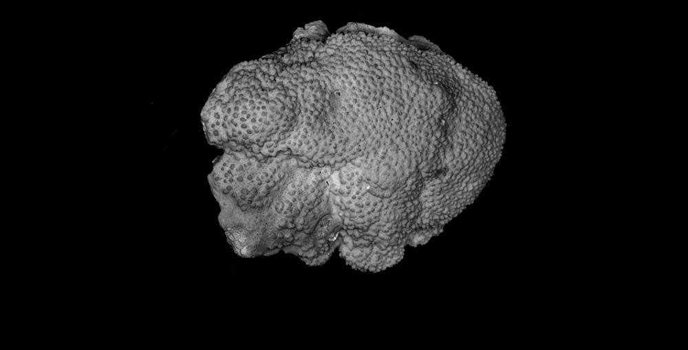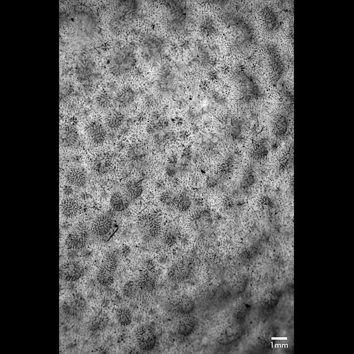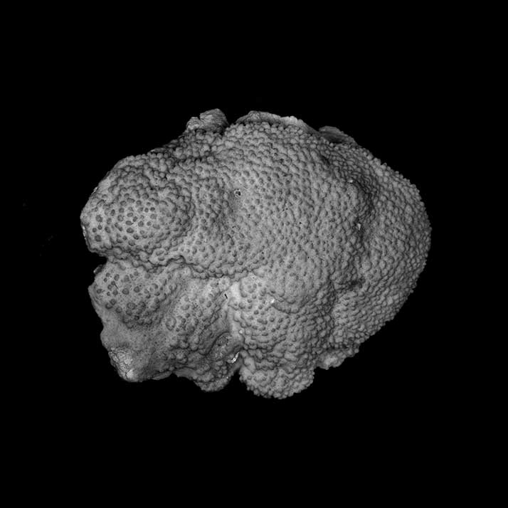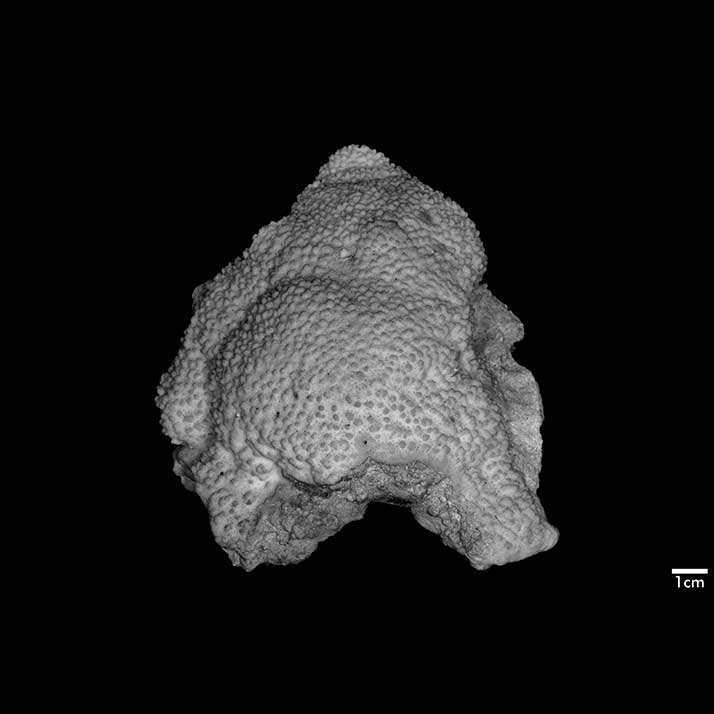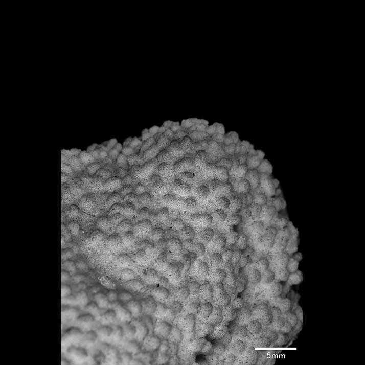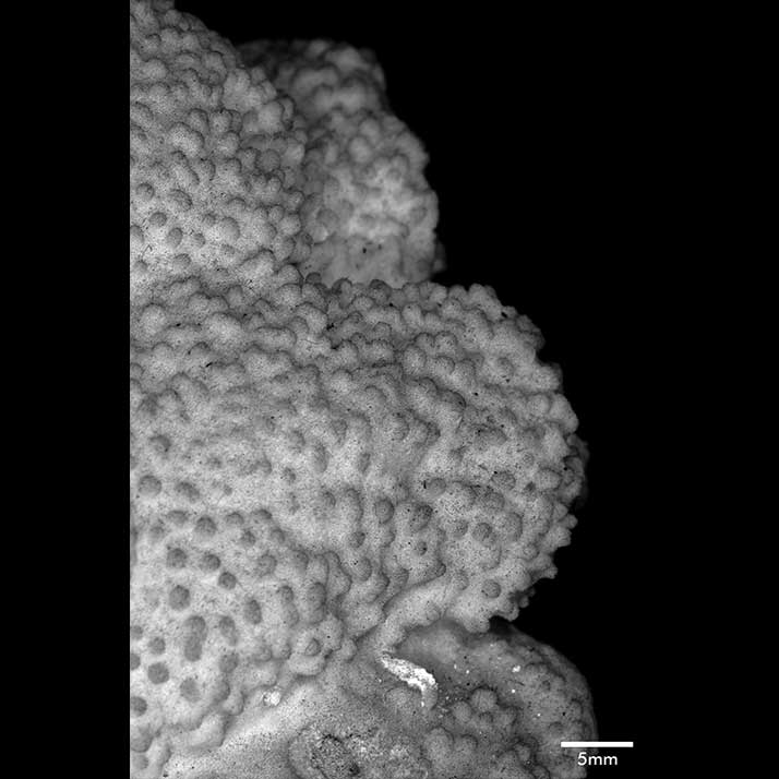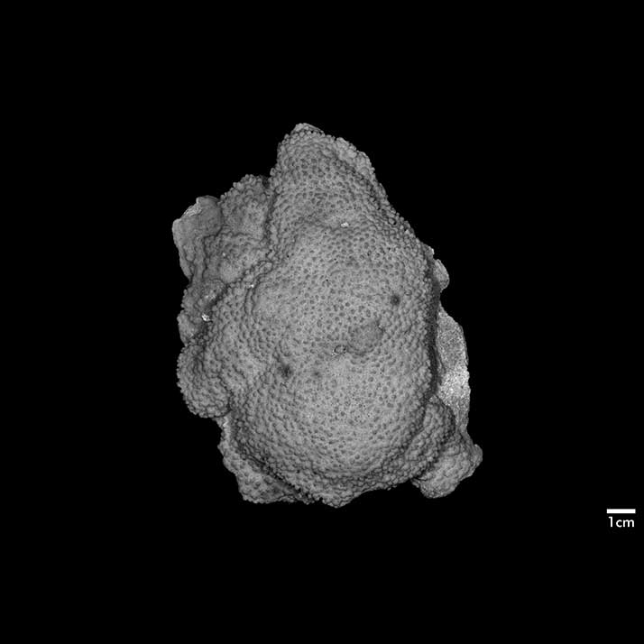 Corallum encrusting on old stock forming massive colony 12 x 8.3 cm across, 6 cm maximum height. Edge closely adhering, only very narrow strip free in some areas; epithecate. Surface evenly dotted all over with mostly nipple-shaped papillae, except near edge where some areas are smooth.