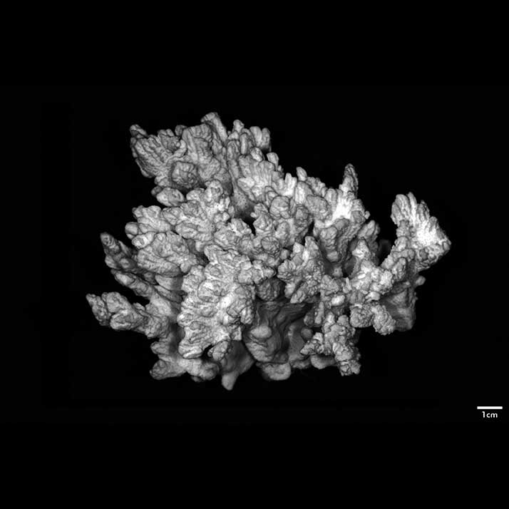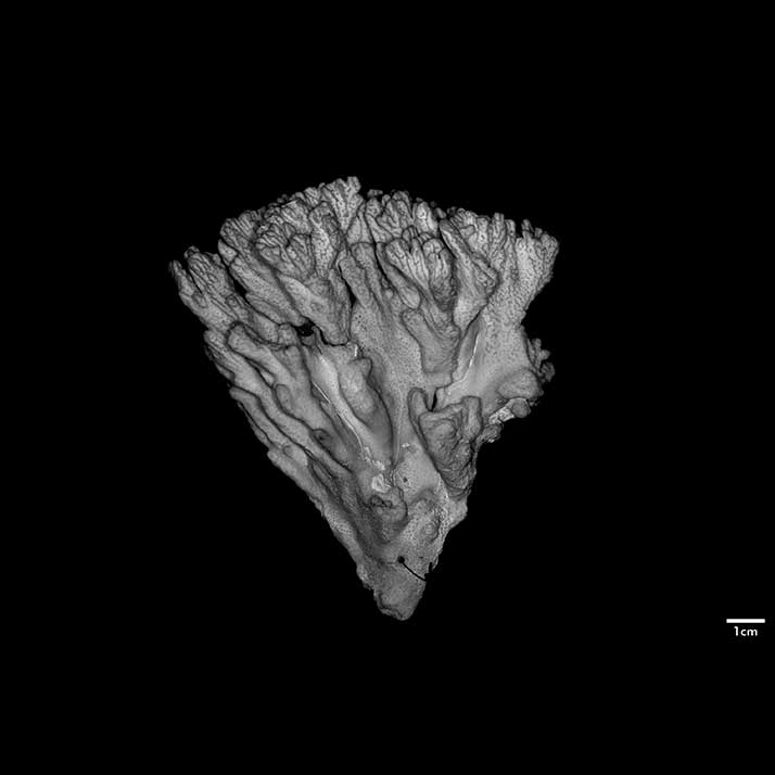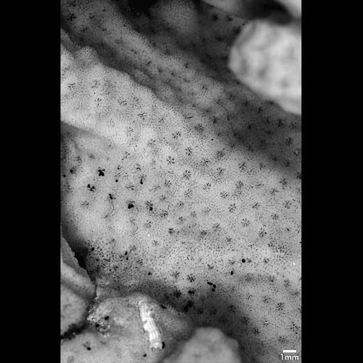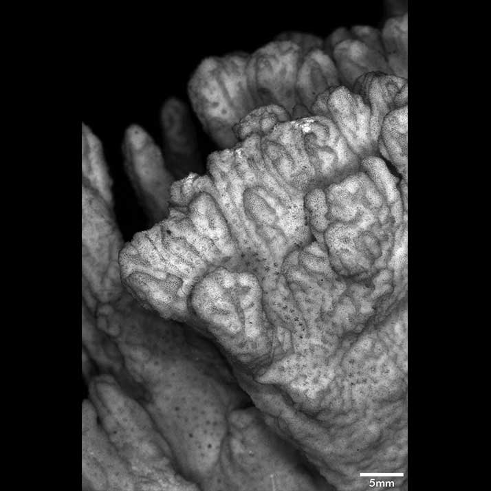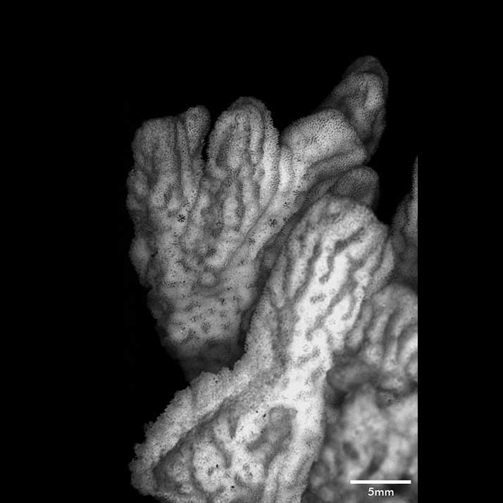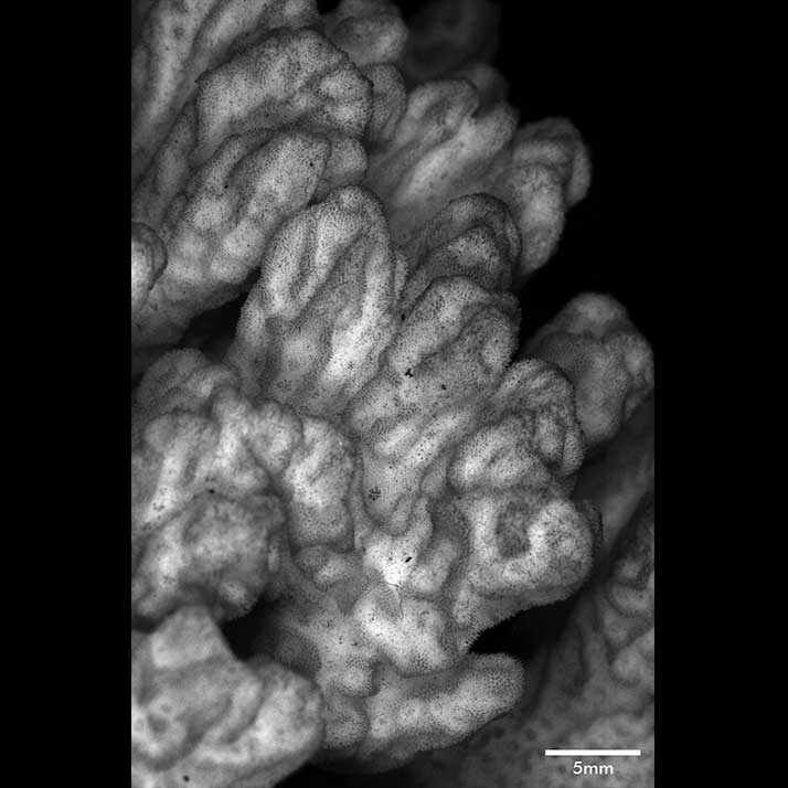 Corallum ramose. Living portion 10-13 cm deep, separated from dead portion by white film or line. Towards the base, it is glabrous, midway it is foveolate, and towards the tip its surface is marked with prominent longitudinal ridges running to the apices. Branches very irregular in form, heavy, very crowded, and very closely coalescent so that boundaries marked merely by depressions or holes. The upper portion of the mass breaks up into short branchlets at the tip. Branchlets usually 1 cm high, very angular because of longitudinal ridges.