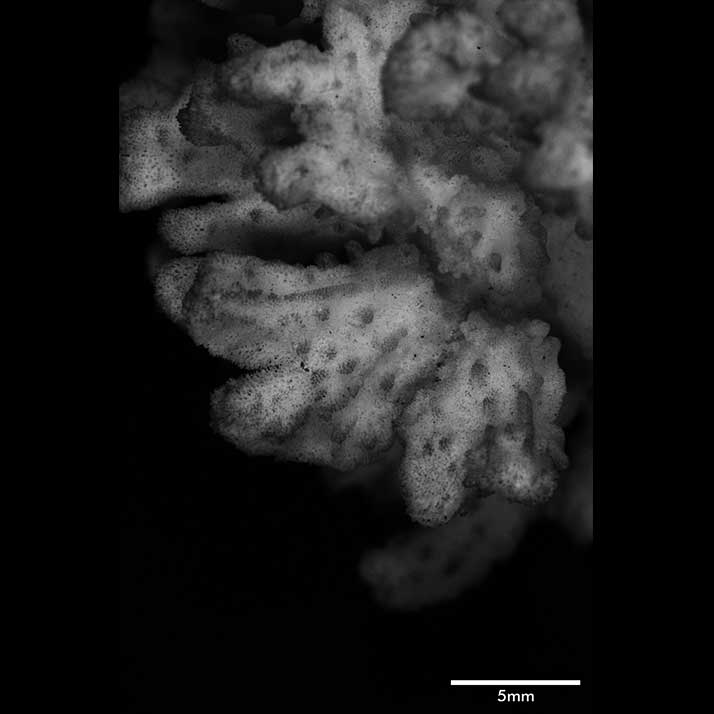 Intercalicinal areas compact, threads coarse, wider than meshes, except within depressions and on tips of branchlets where reticulum lax; in some areas, especially on lower surface of inclining branches surface appear cracked because of meshes extending some distance. Papillae of various sizes; on expanded upper region, fine papillae strewn around among tall cylindrical ones and ridges. Surface spines fine with granulous or spinulous tips.