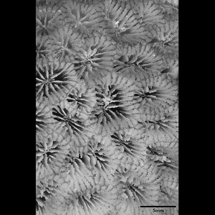 Corallites monocentric, at most 2 centers in non-dividing valleys; most corallites monocentric. Maximum length of valleys 9-10 mm, width 5 mm; depth 5 mm. Wall very thin, less than a mm, its top sharp.