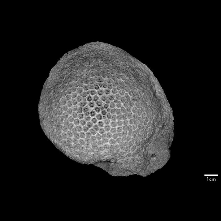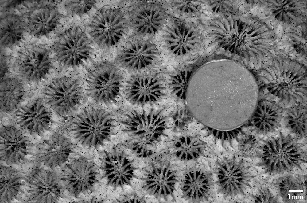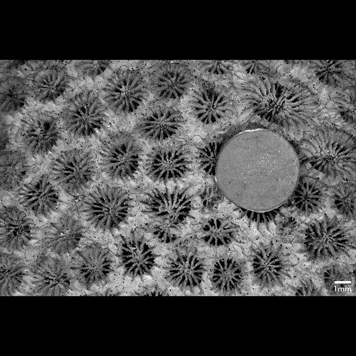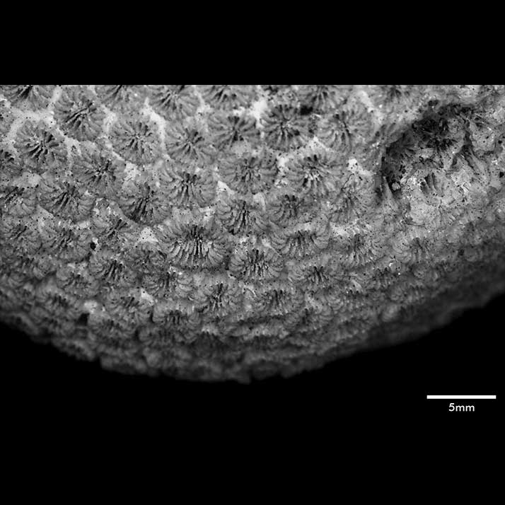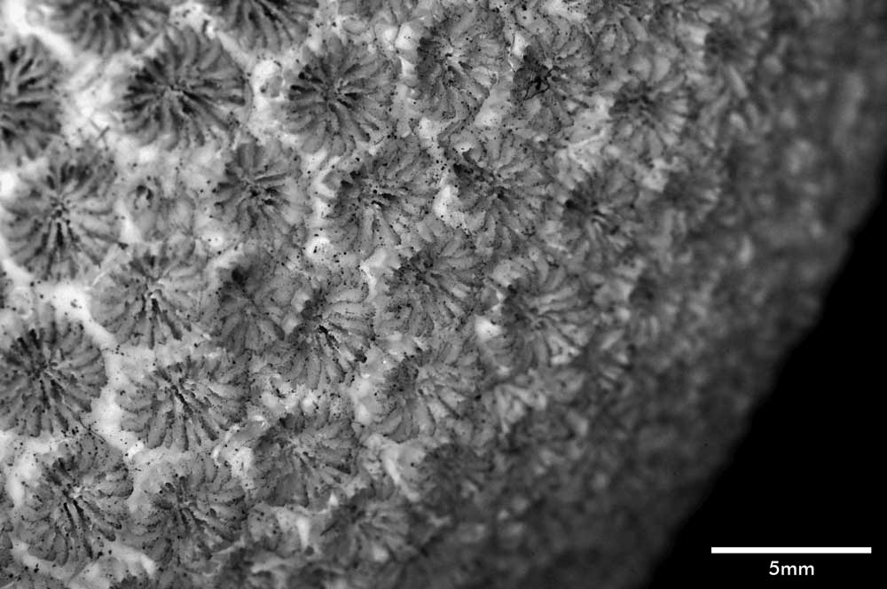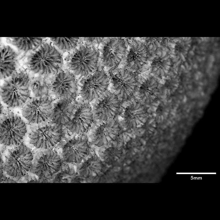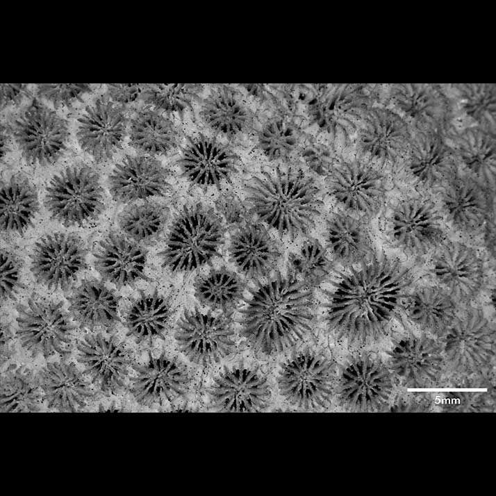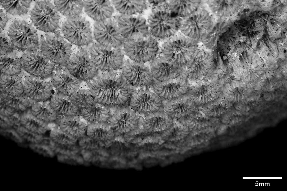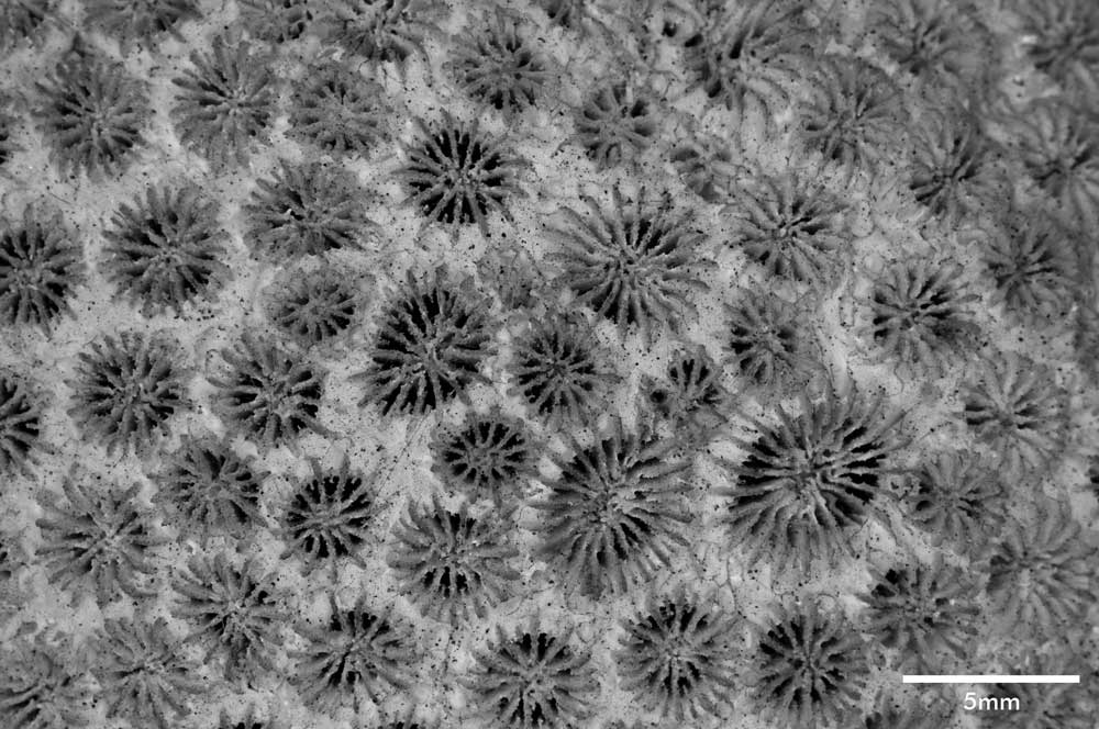 Corallites round, protruding at most 1 mm, mostly less, somewhat evenly distributed, 1 mm or less distant. Calices shallow, up to 4 mm across; “giant” corallites 5- 6 mm across present. Along edge of corallum, many corallites appear ascending in position so costae on lower side prolonged. Wall thin, sometimes incomplete so loculi merge into perithecal vesicles.