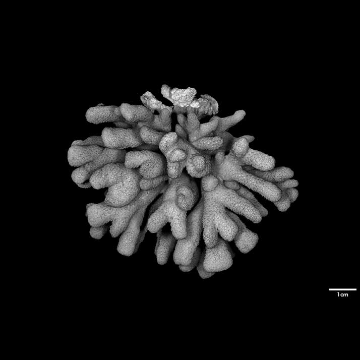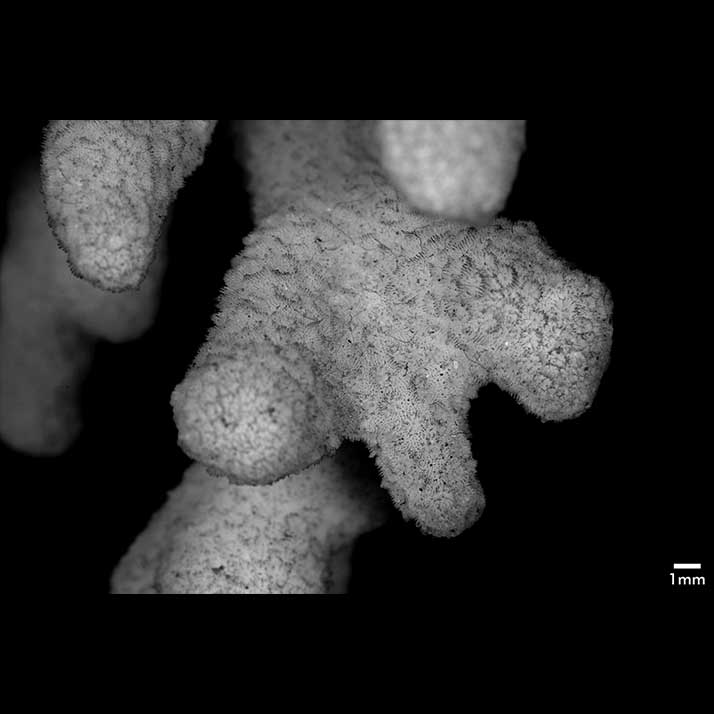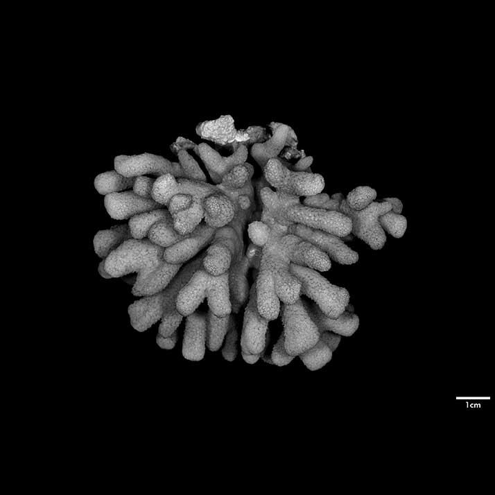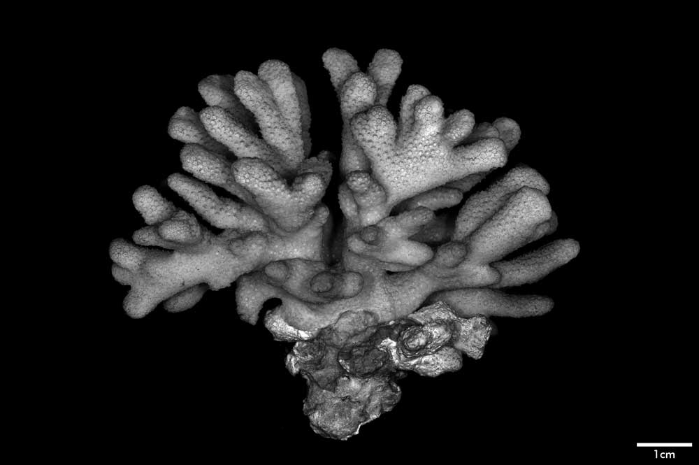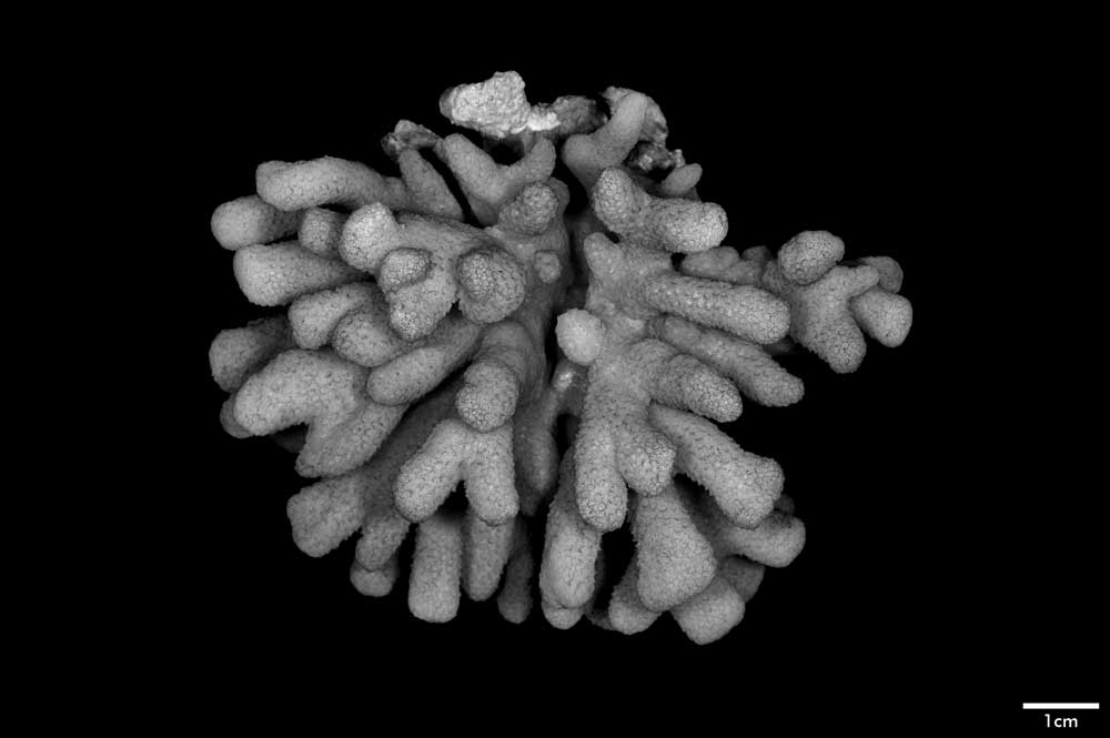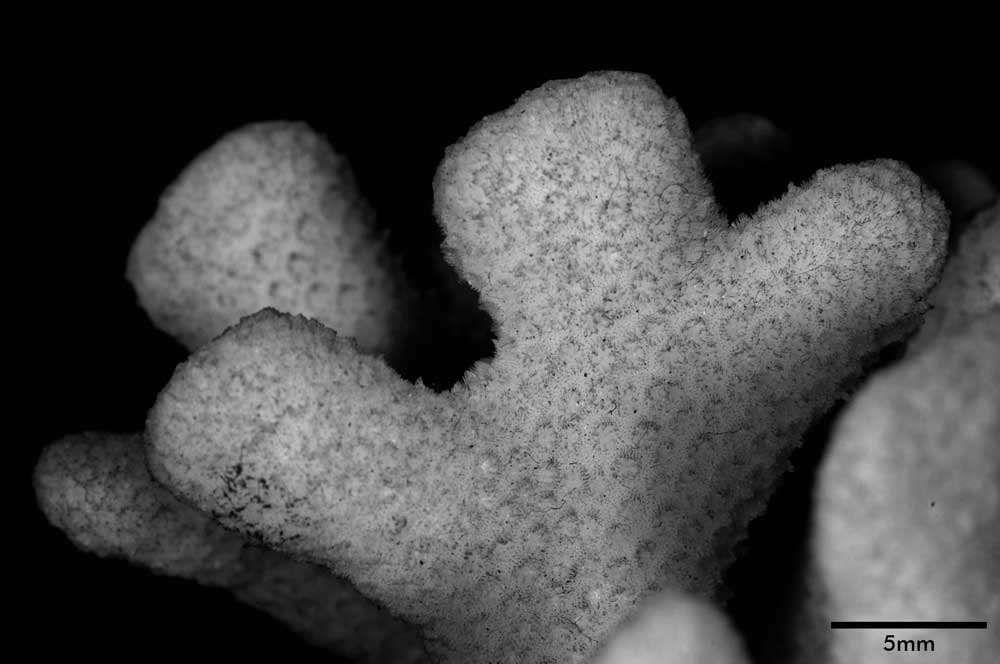 Corallum standing around 6 cm high, subhemispherical, about 8 cm across; base small; composed of flattened stems – one 10 x 7 mm at base. Branches non-coalescent, wedge-shaped, not attenuated, their tips flat – one 7 x 3.5 mm; another 12 x 4 mm.