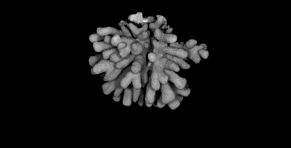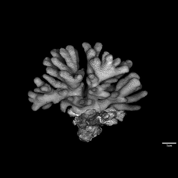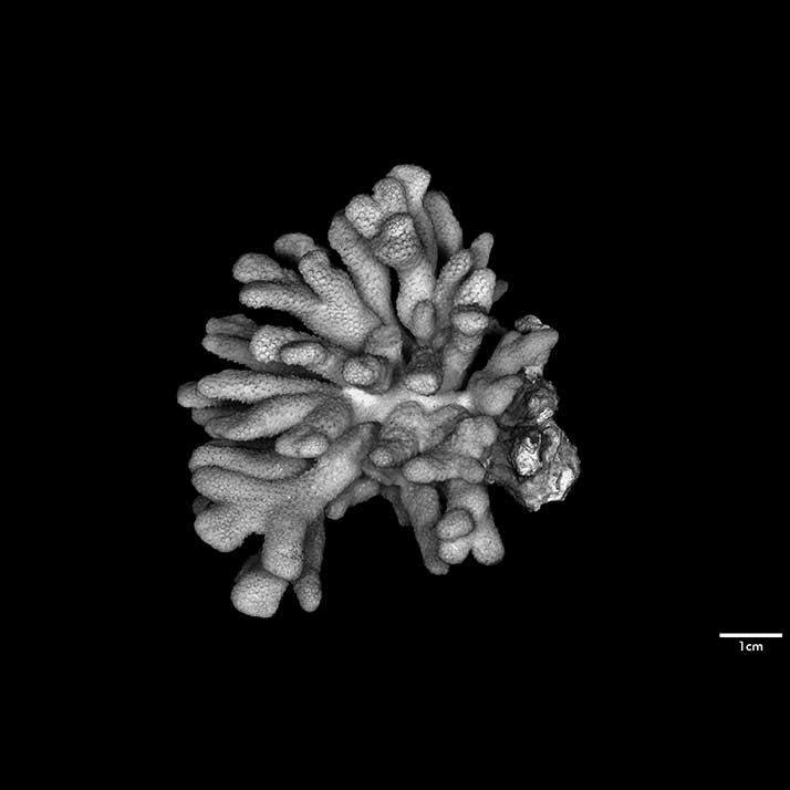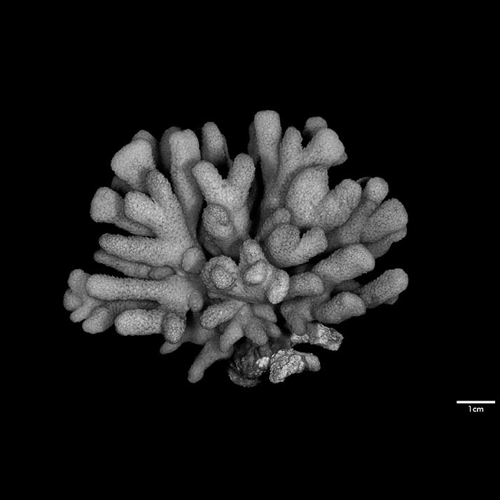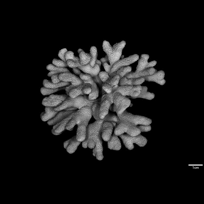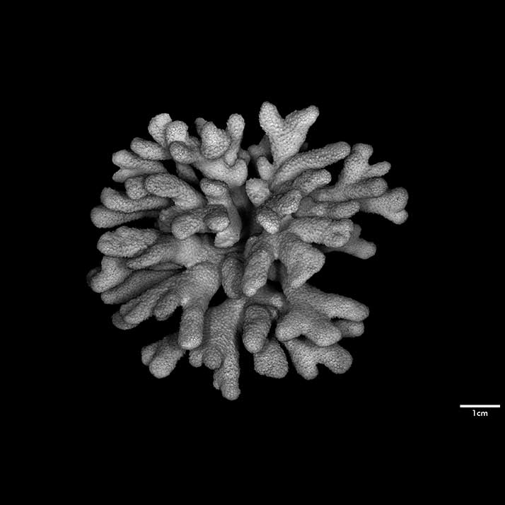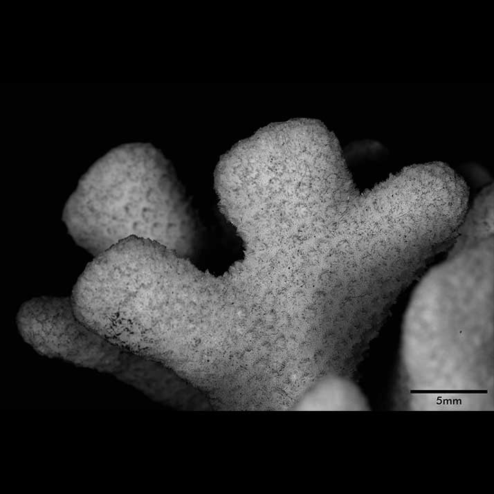 Corallum standing around 6 cm high, subhemispherical, about 8 cm across; base small; composed of flattened stems – one 10 x 7 mm at base. Branches non-coalescent, wedge-shaped, not attenuated, their tips flat – one 7 x 3.5 mm; another 12 x 4 mm.