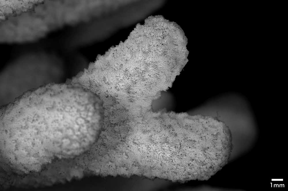 Calicles crowded; 0.8 mm diameter; polygonal on tips of branches, becoming circular below; distinctly hooded in some areas; slightly elevated with thick wall but even with surface in others. Hood not always on upper side; obtuse or acute; in the latter case the highest point is a primary septum; opposite wall obsolete. Rows of spines run down outer surface of wall simulating costae. Hoods and contiguous perithecal areas just below apices of most branchlets marked by distinct ridges, with or without spines.