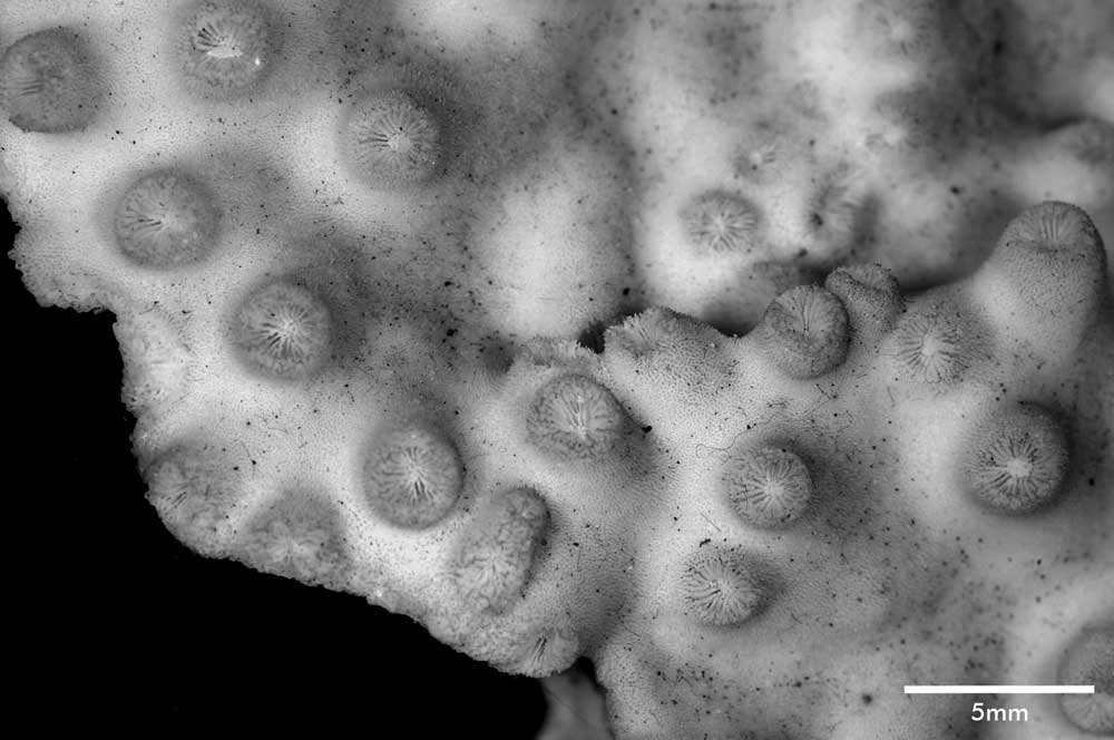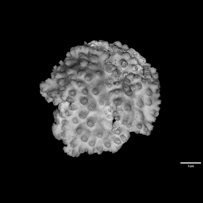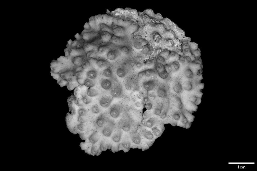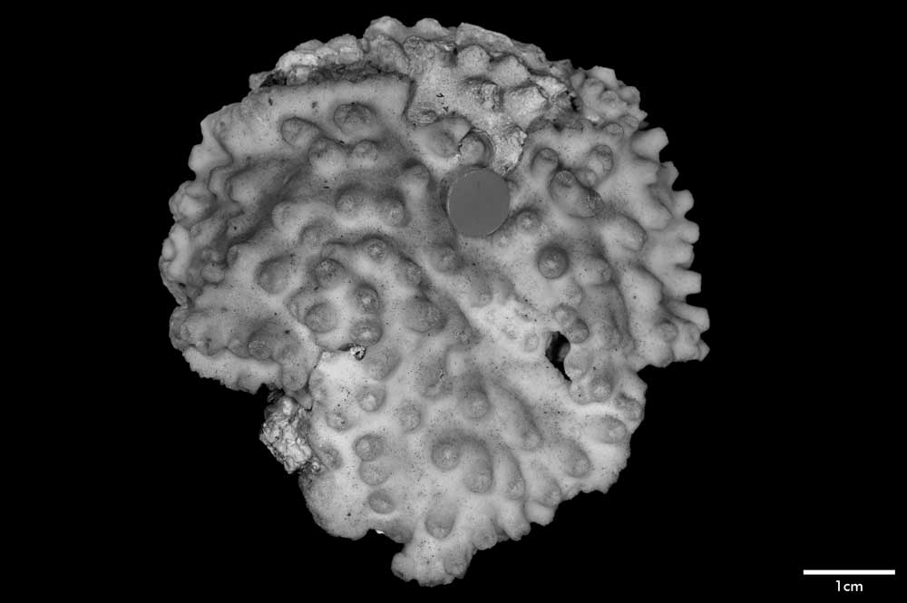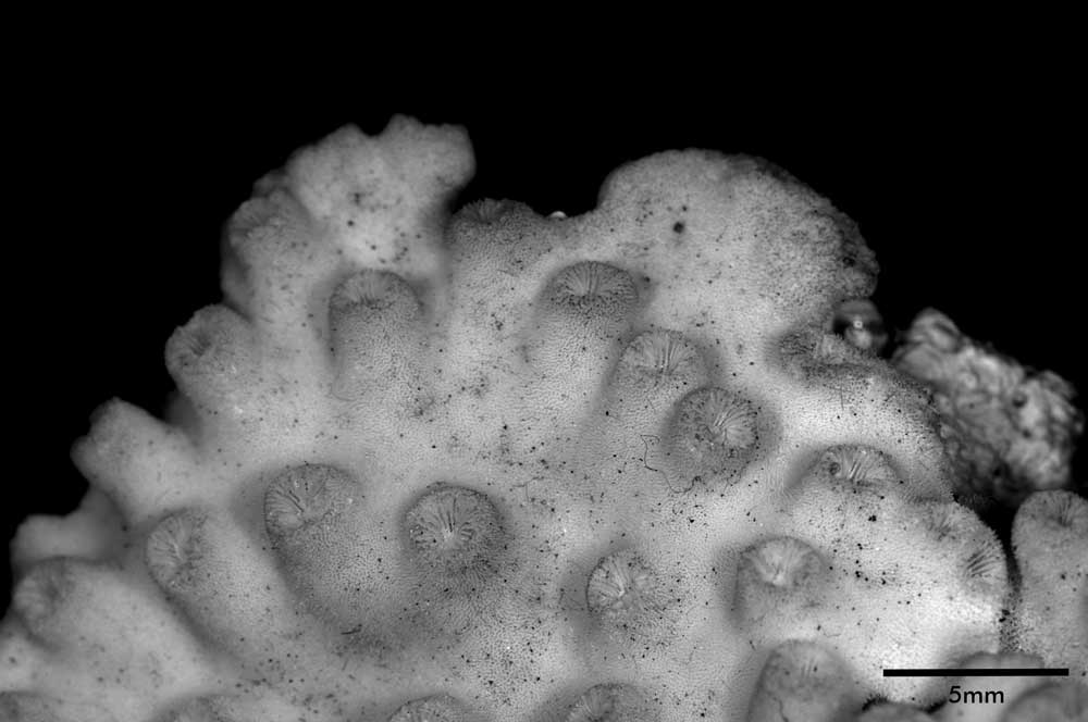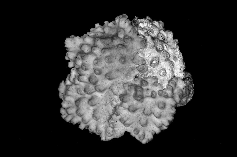 Corallum creeping on dead coral of the same kind; its free edge almost 2 mm thick, lined with young corallites; 6 x 4 cm diameter.