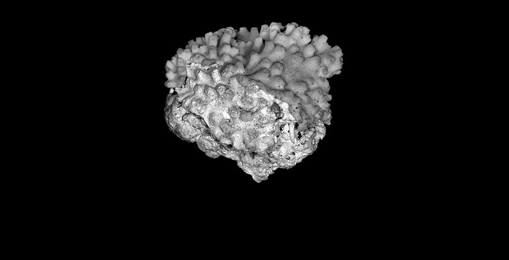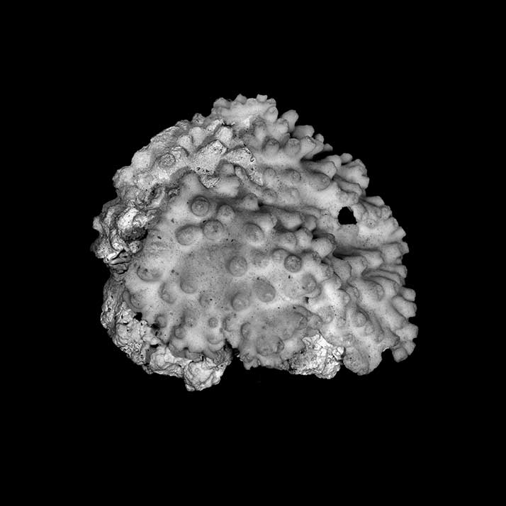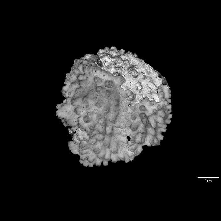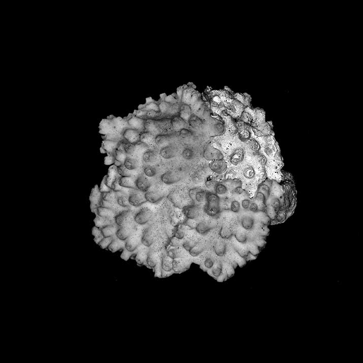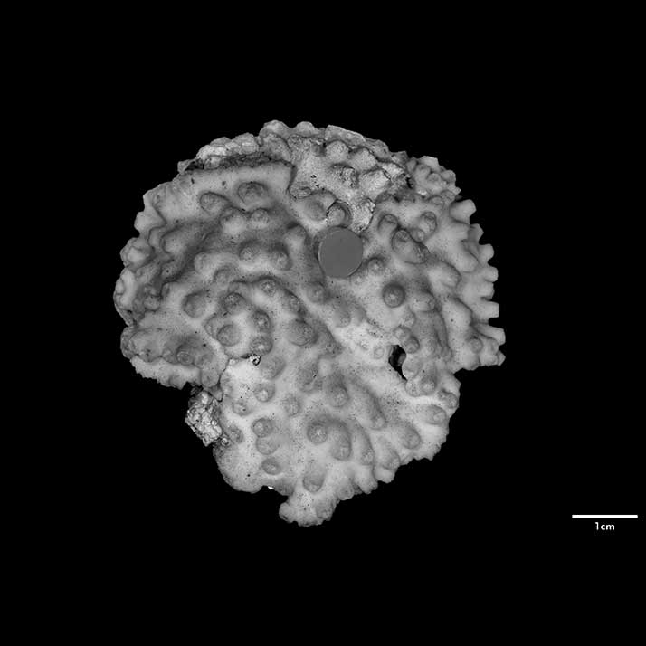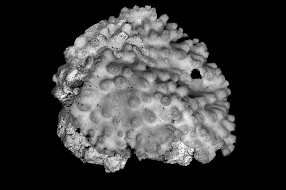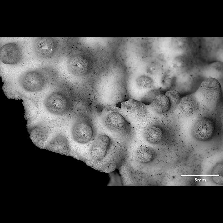 Corallum creeping on dead coral of the same kind; its free edge almost 2 mm thick, lined with young corallites; 6 x 4 cm diameter.