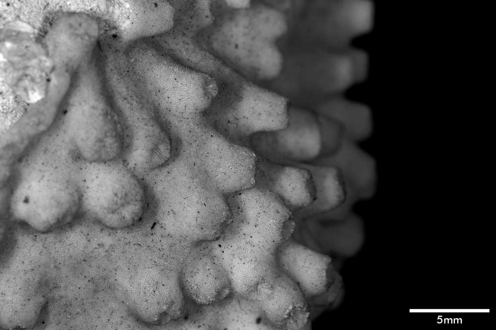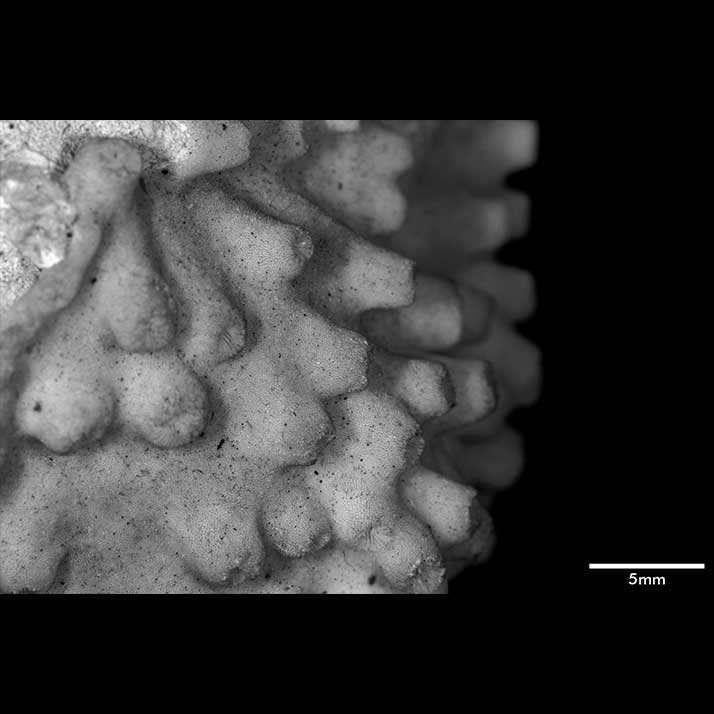 Intercalicinal area covered with very fine, even spines standing on close reticulum which is generally obscured except in some limited areas—the reticulum takes the place of the ridge and furrow arrangement. A similar construction is present on the lower surface of the corallum.