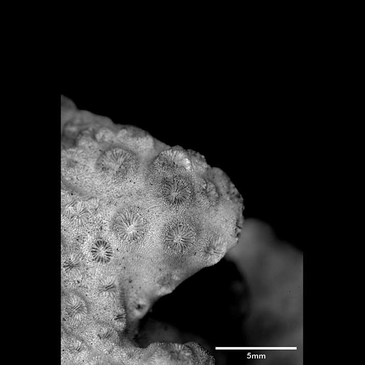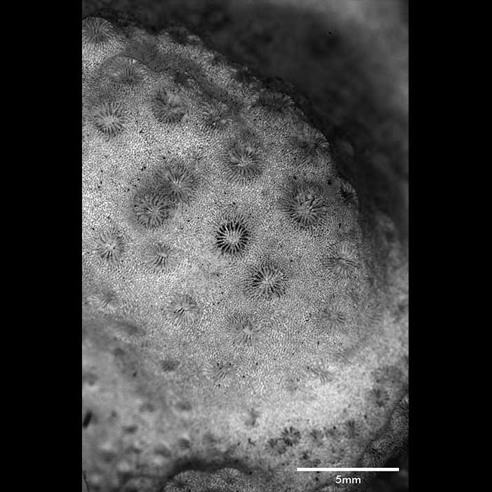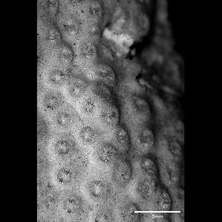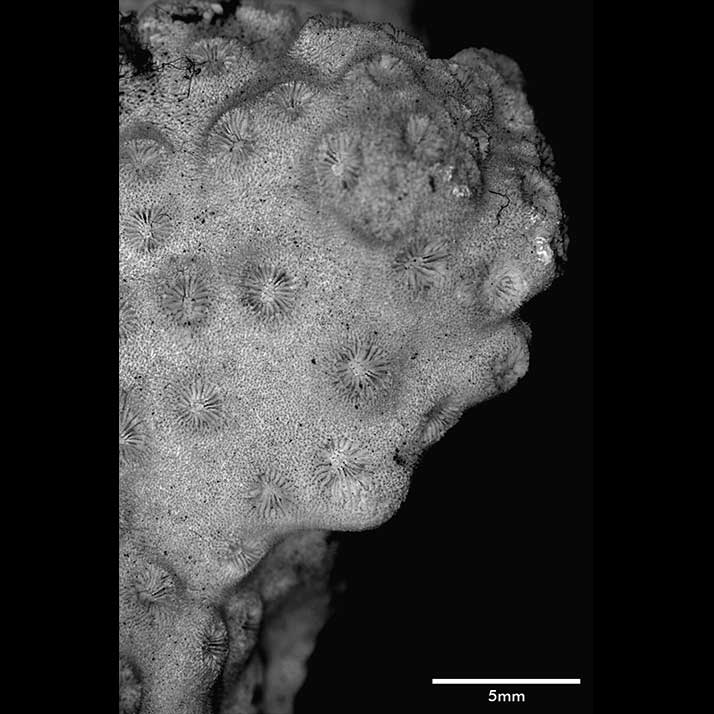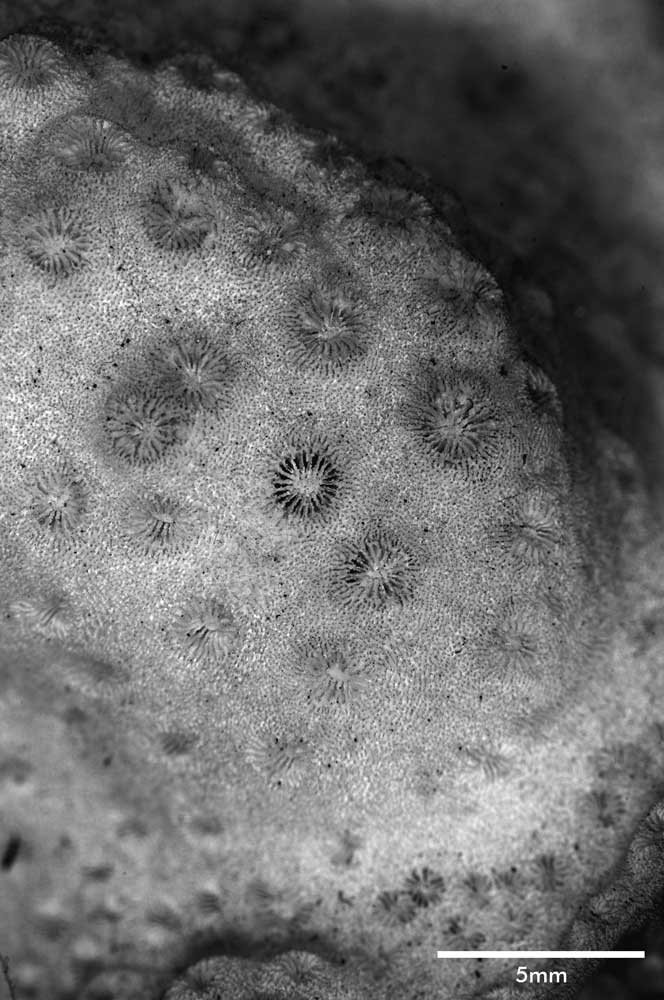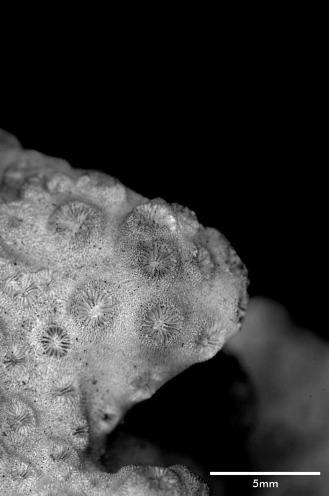 Peritheca velvety in texture; very fine ridge and furrow system discernible, gyrating around corallites, the very thin ridges surmounted with very fine sharp spines. Tiny pores can be recognized on close examination with a lens.