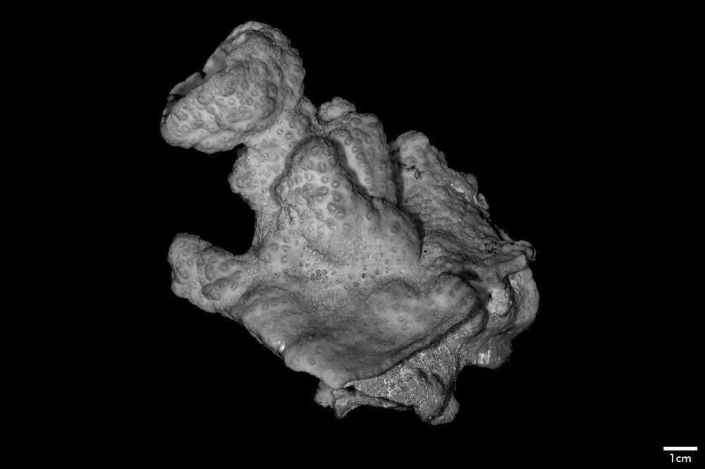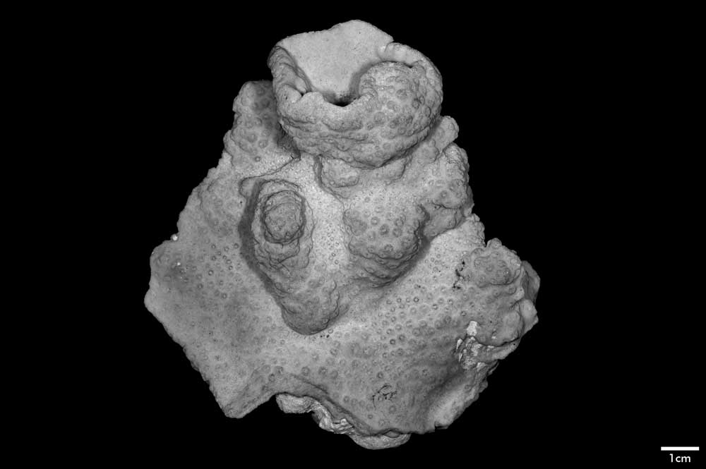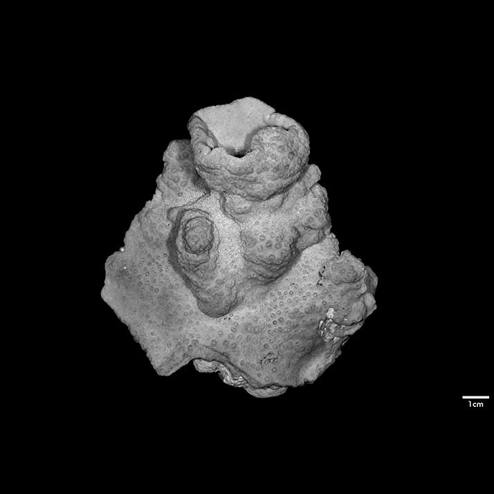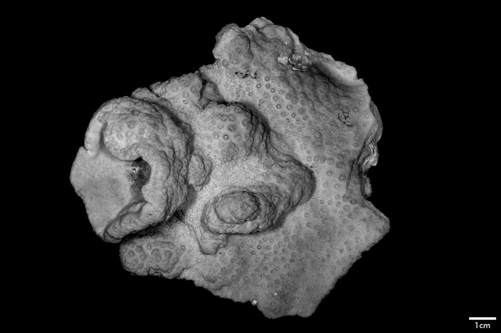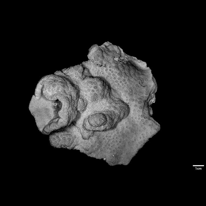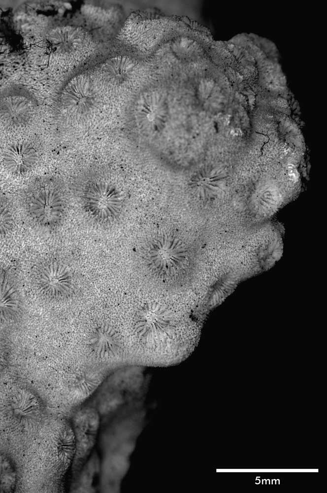 Corallum encrusting on dead coral of same kind; growing edge free, slightly upturned, around 2 mm thick, lined with small corallites. Upper surface with prominent nodules of various height, one open at the top producing a small cup, 3 cm across at mouth..