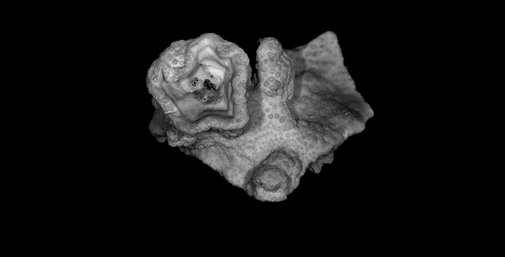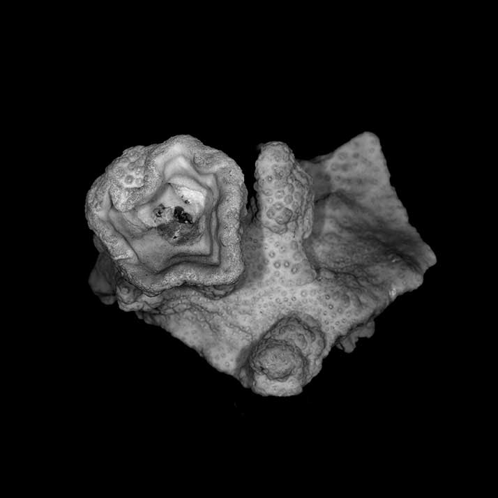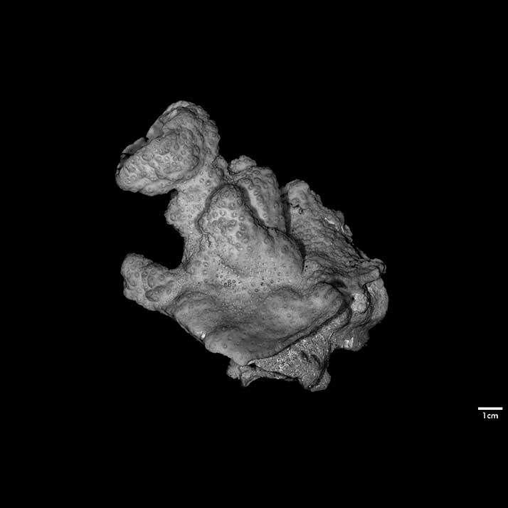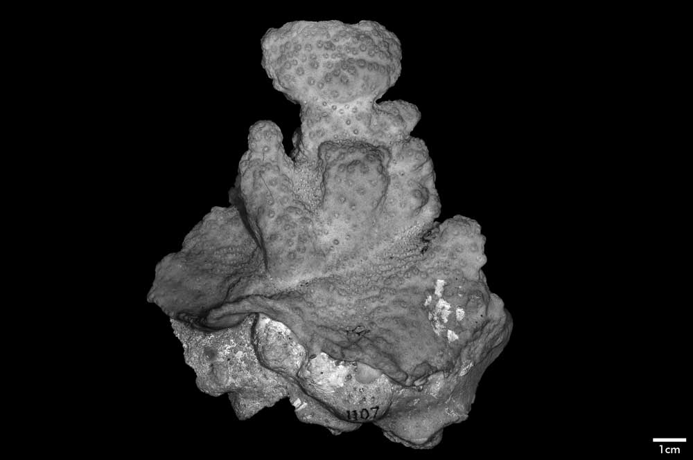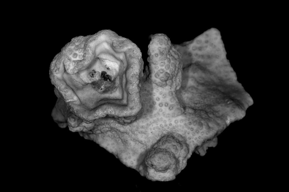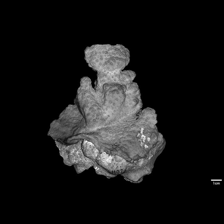 Corallum encrusting on dead coral of same kind; growing edge free, slightly upturned, around 2 mm thick, lined with small corallites. Upper surface with prominent nodules of various height, one open at the top producing a small cup, 3 cm across at mouth..