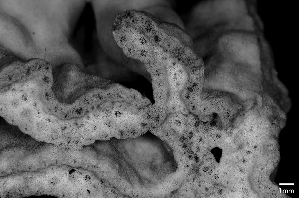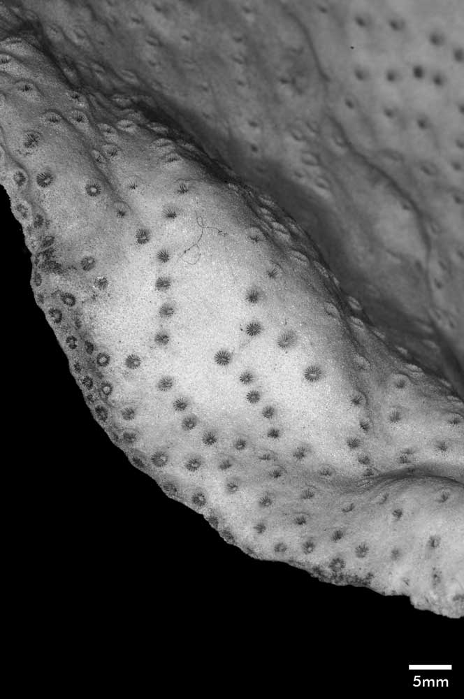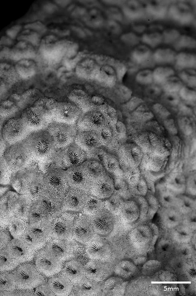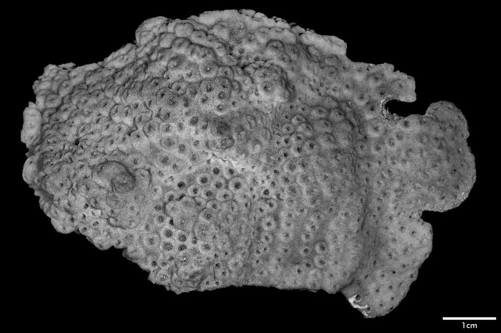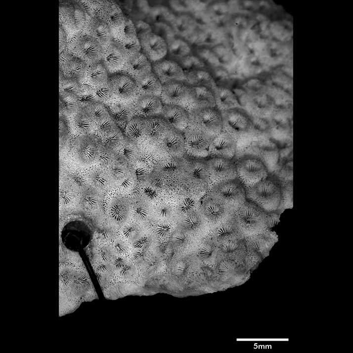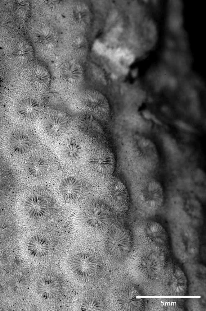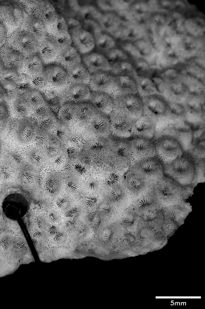 Corallum incrusting, its upper surface nodulous, older portion around 8 mm thick, its edge only 2 mm. Growing edge lobed, lined with small immersed corallites.