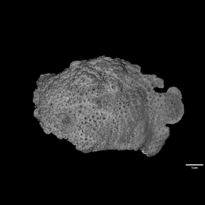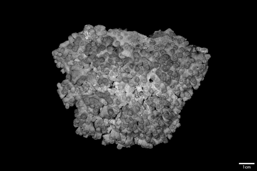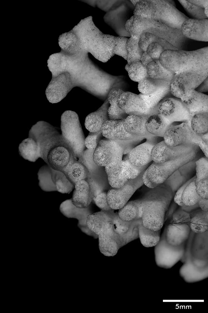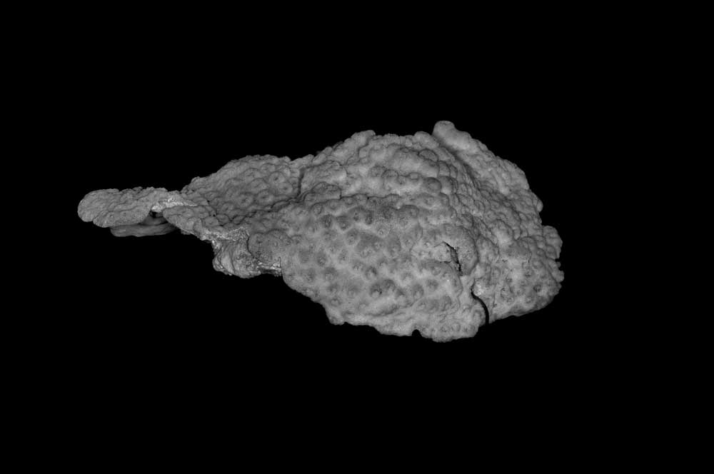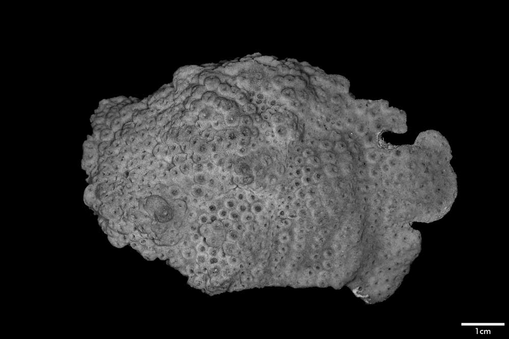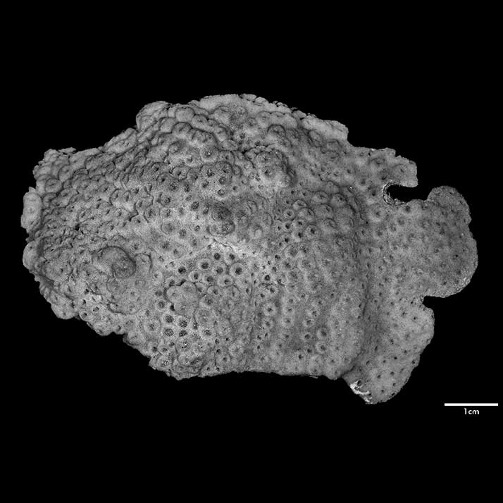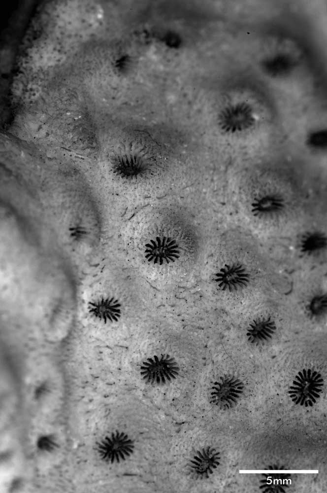 Corallum incrusting, its upper surface nodulous, older portion around 8 mm thick, its edge only 2 mm. Growing edge lobed, lined with small immersed corallites.