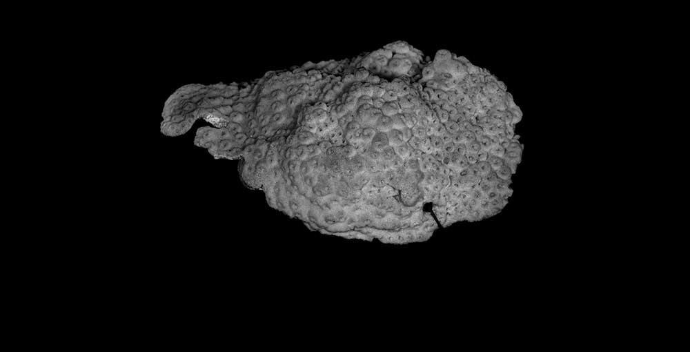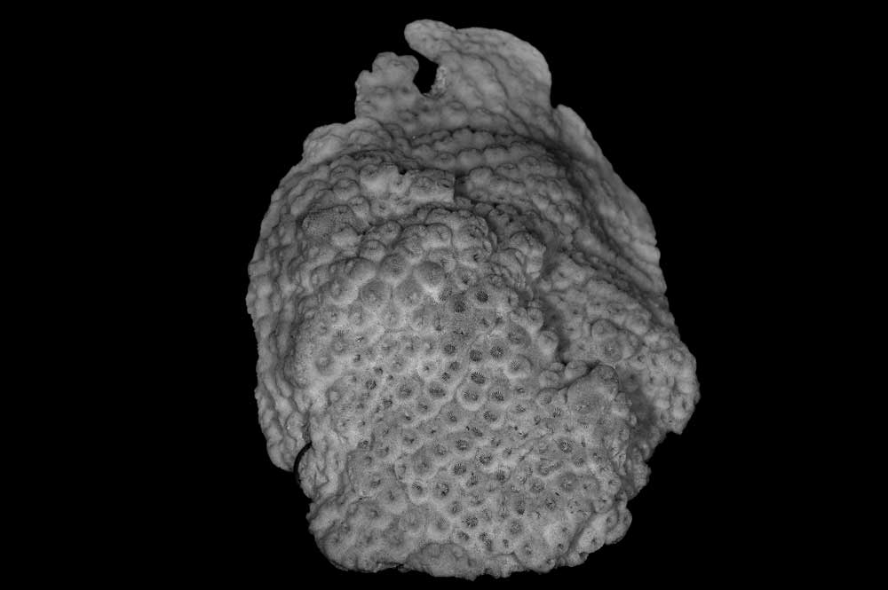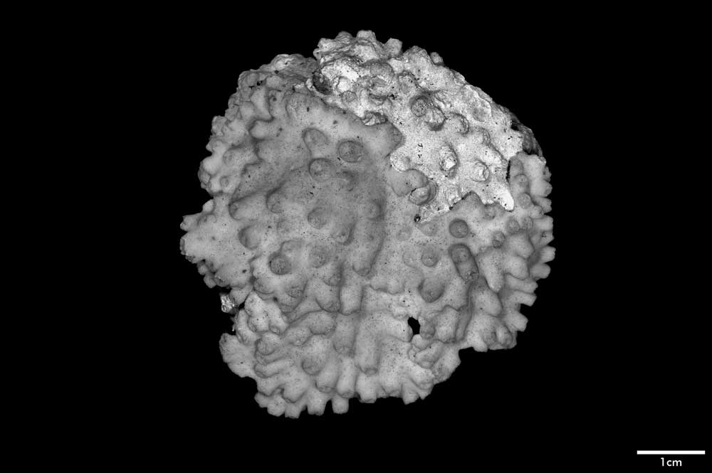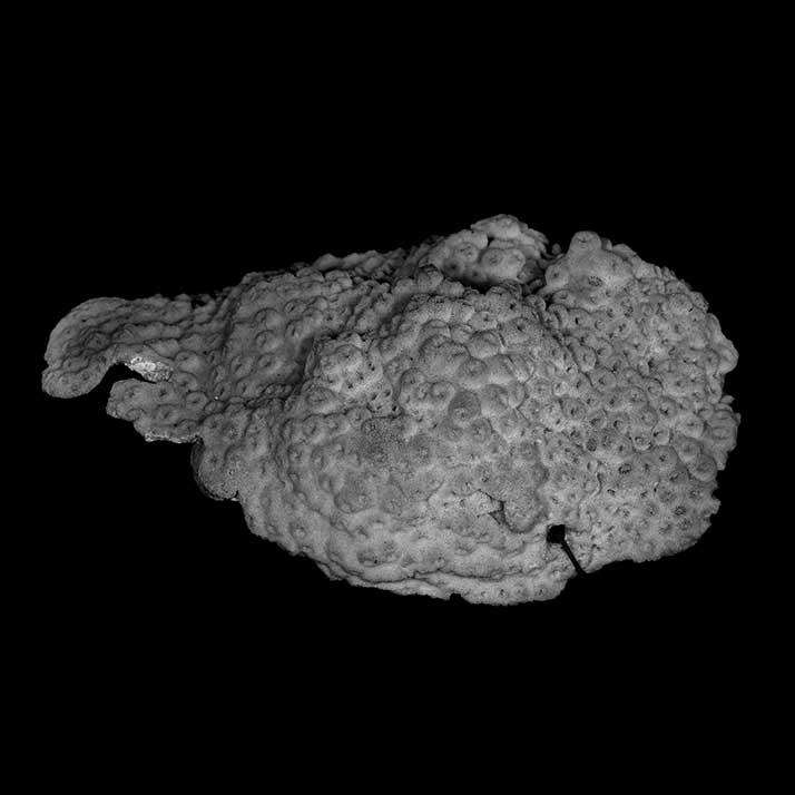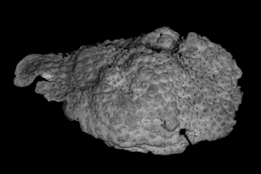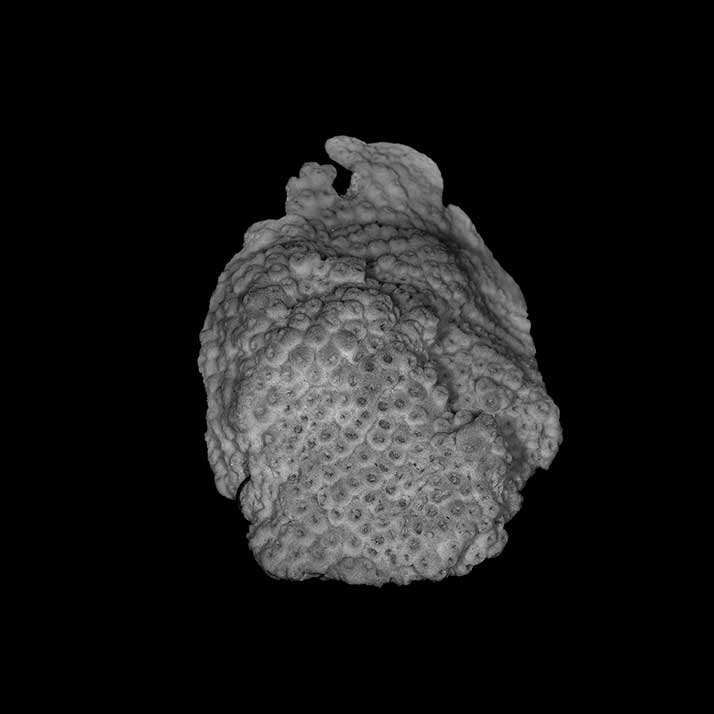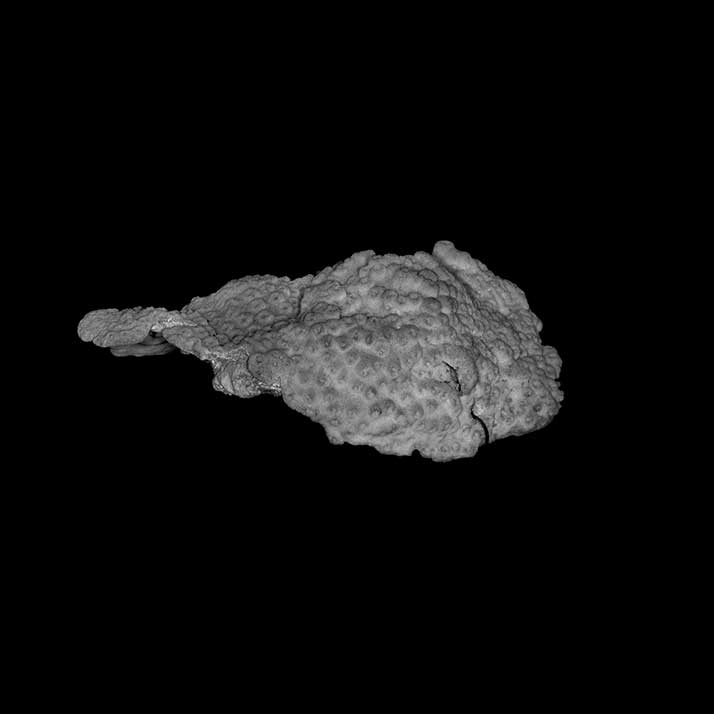 Corallum incrusting, its upper surface nodulous, older portion around 8 mm thick, its edge only 2 mm. Growing edge lobed, lined with small immersed corallites.