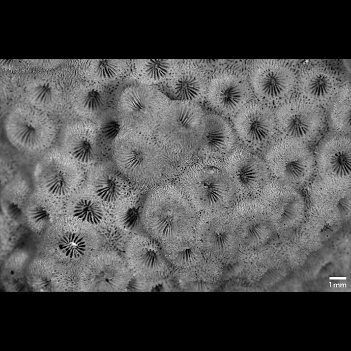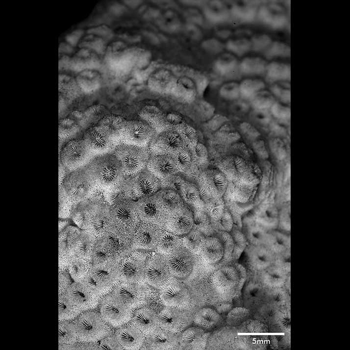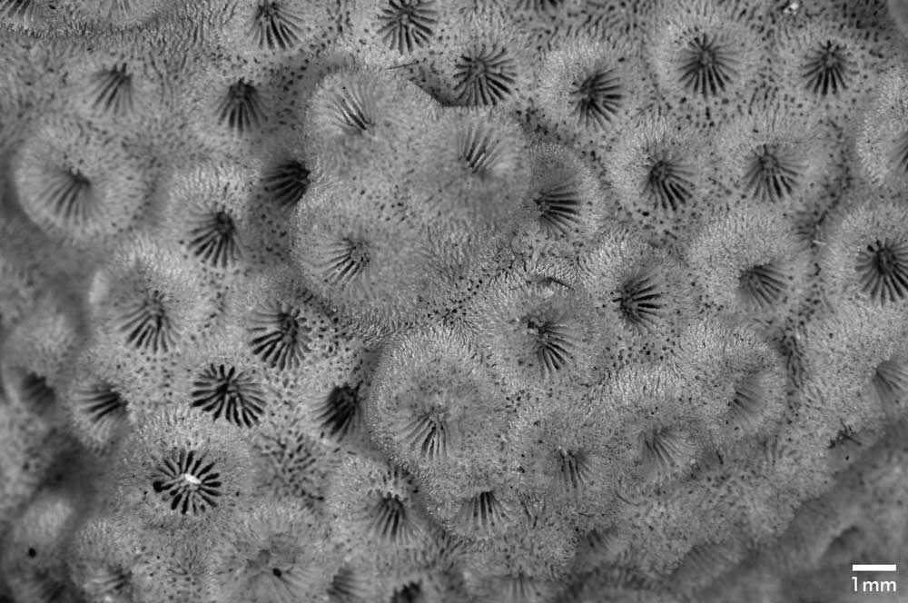 Perithecal ridges very thin, cut into very fine sharp spines of uniform height; furrows wider than ridges; pits visible all over. Spines of the same appearance cover outer surface of calicinal wall. The nature of these spines and the uniformity of the septa gives this coral its neat appearance.