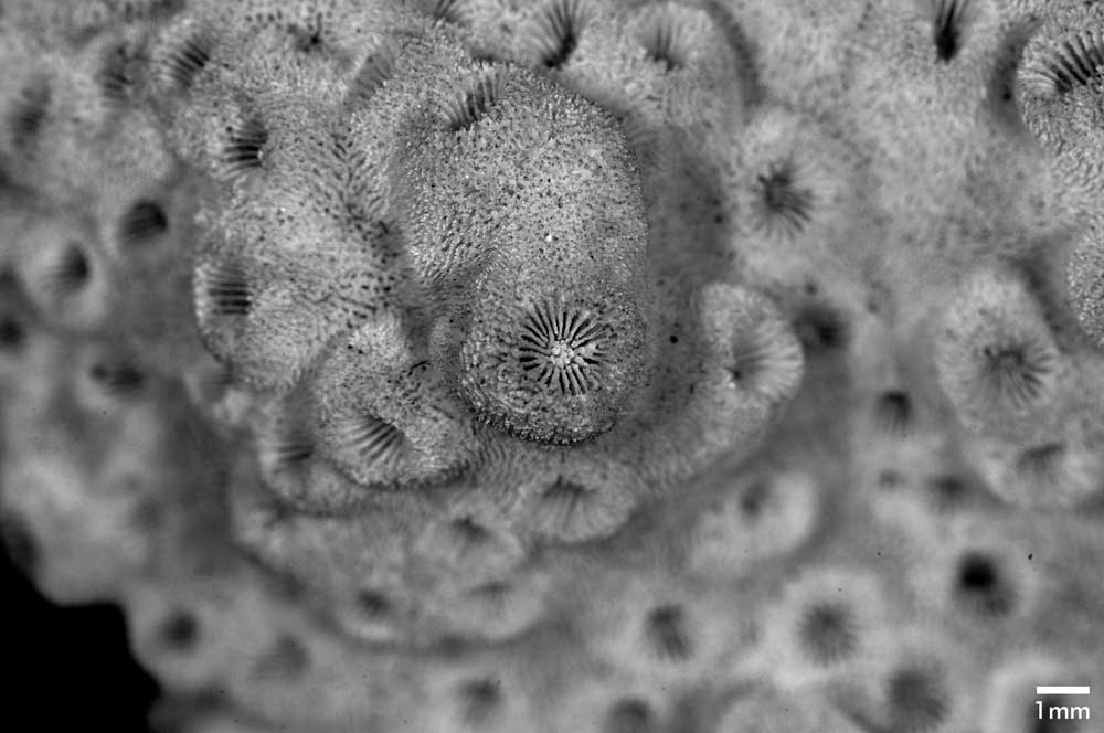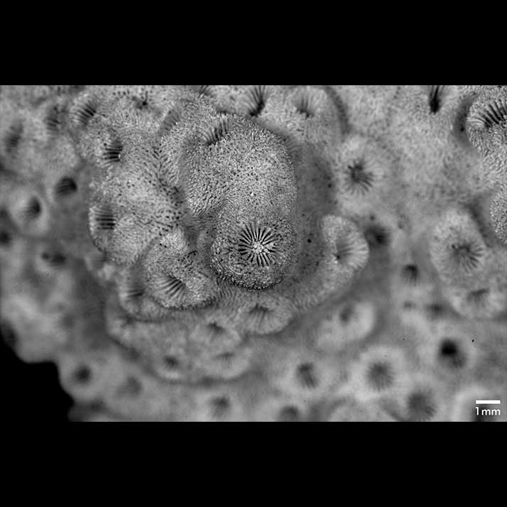 Corallites on older portion of corallum projecting up to 3 mm, their tops rounded (globose); not completely occupied by calice; very crowded, often with only groove separating them; some cases of fusion of 2 adjoining corallites of same height. Wall neatly rounded, appearing thick. Corallites on younger portion with wider perithecal areas; only slightly protruding, one side (media) higher than the other.