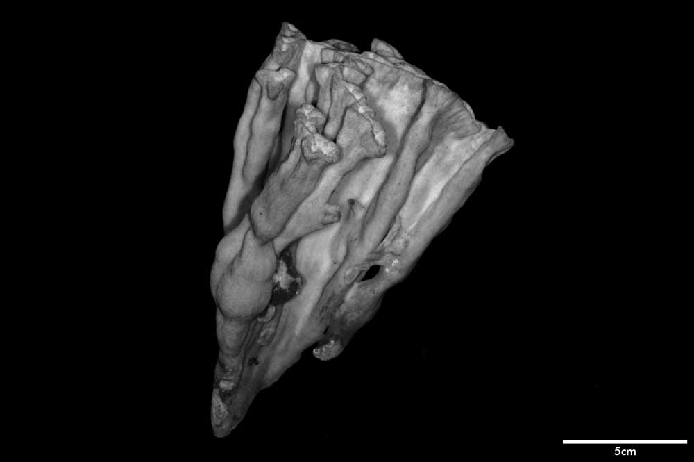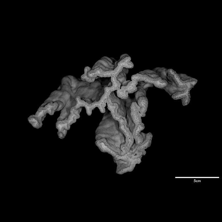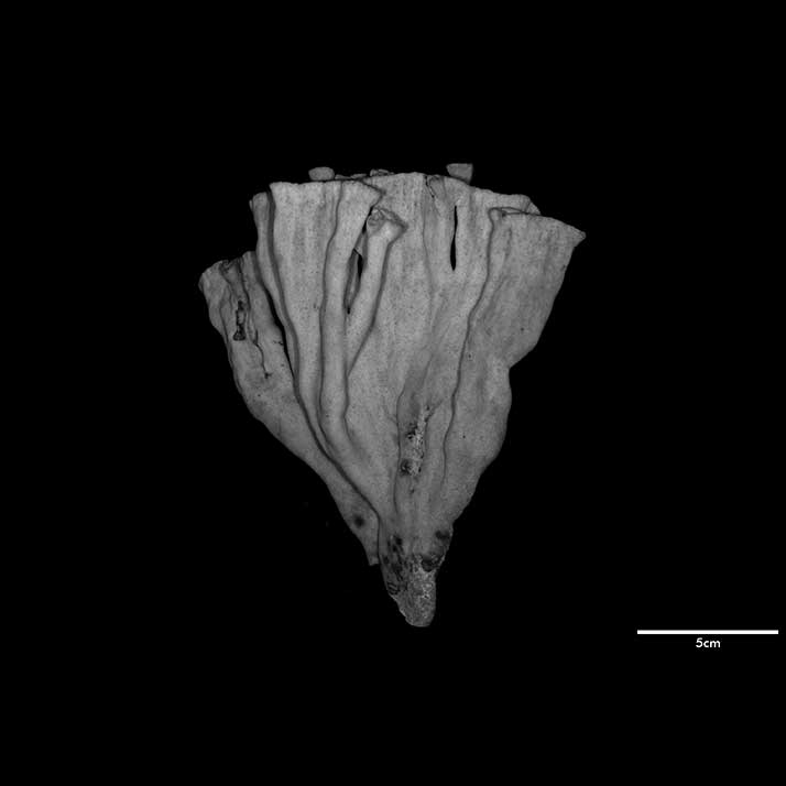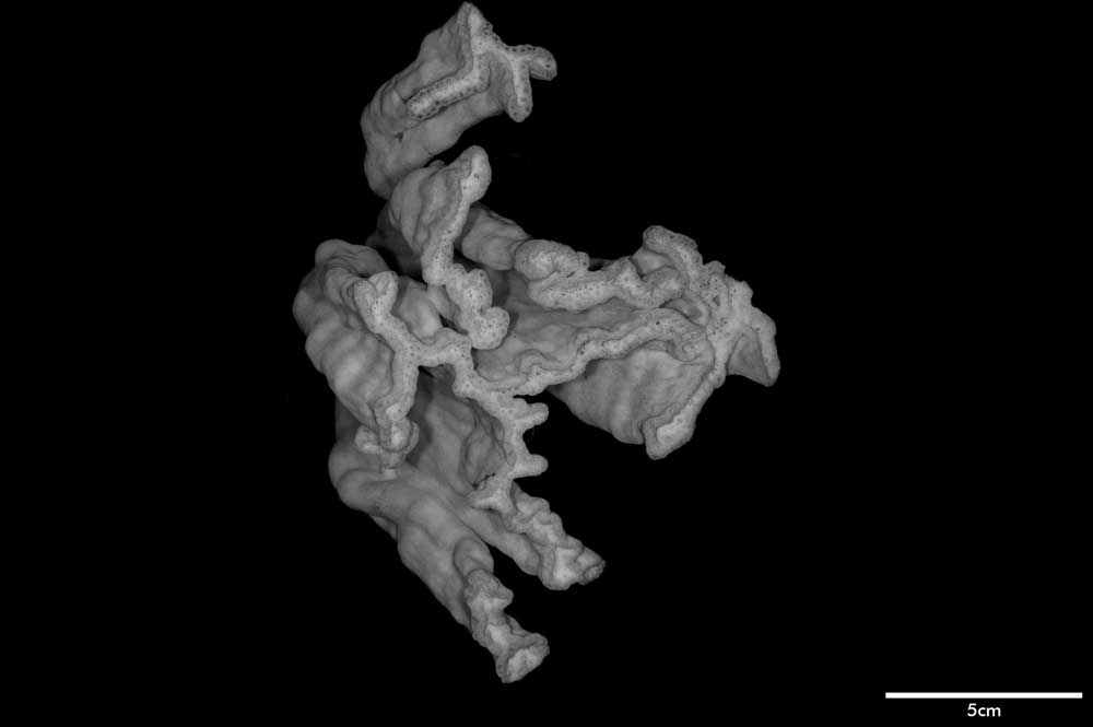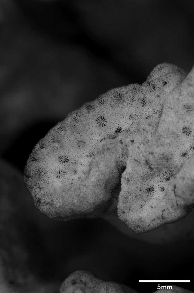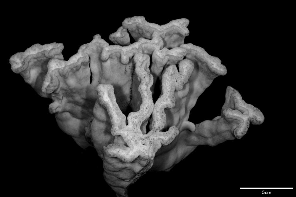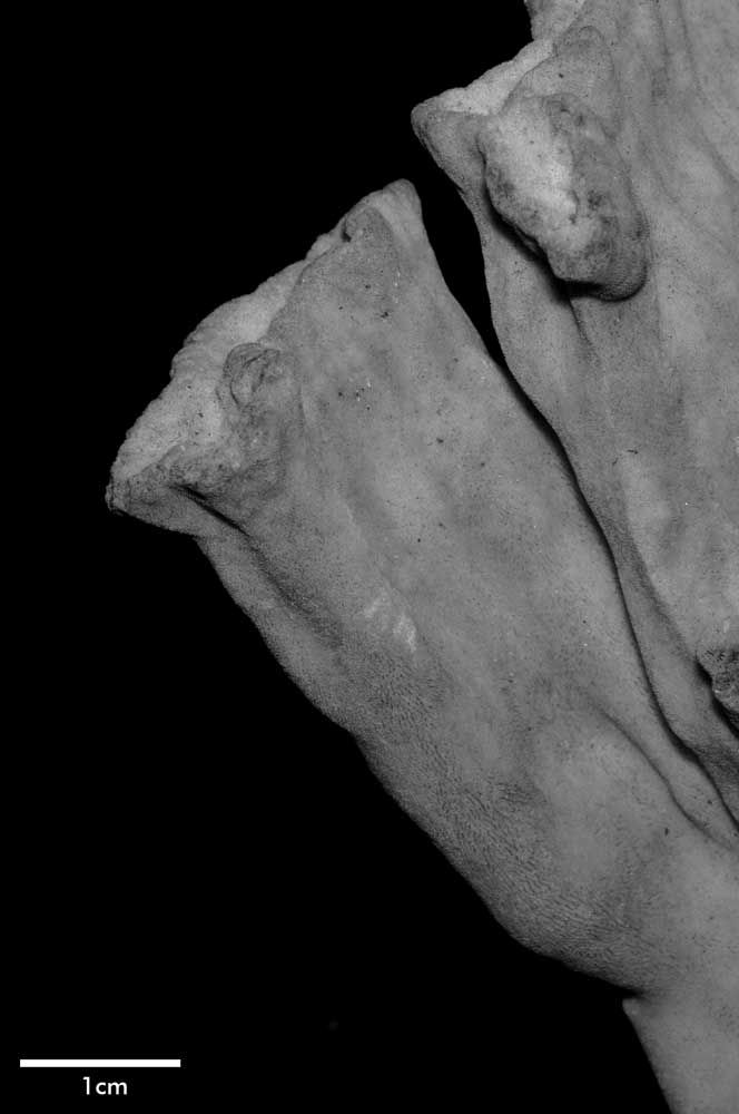 Corallum flabello-phaceloid: living portion 15 cm high (specimen is a fragment of a big colony). Calicular surface confined to narrow region within meandering valleys. Corallum appears to be close fusion of vertical compressed stems reaching common level, sides marked with longitudinal depressions. Individual stem wedged-shaped; one not fully fused: 1 cm across at base, 3.4 cm x 0.7 cm at apex. Non-calicular surface (side of colony) made uneven by low swellings; constricted, surface around 7 mm below apex; above this line of constriction, surface appears shirred; ridge and furrows system well developed with ridges wider than furrows but this relation is reversed near apex; ridges armed with spines in very short rows, either crosswise or oblique in position.
