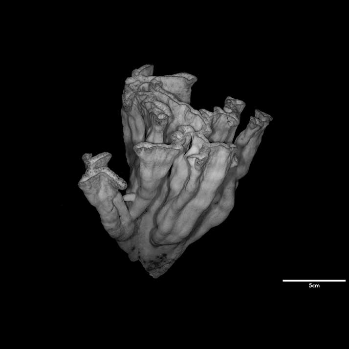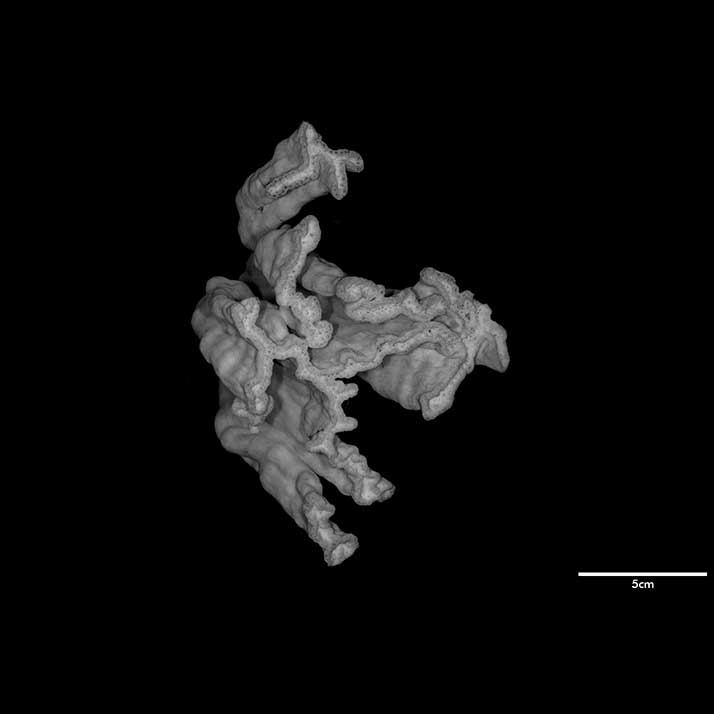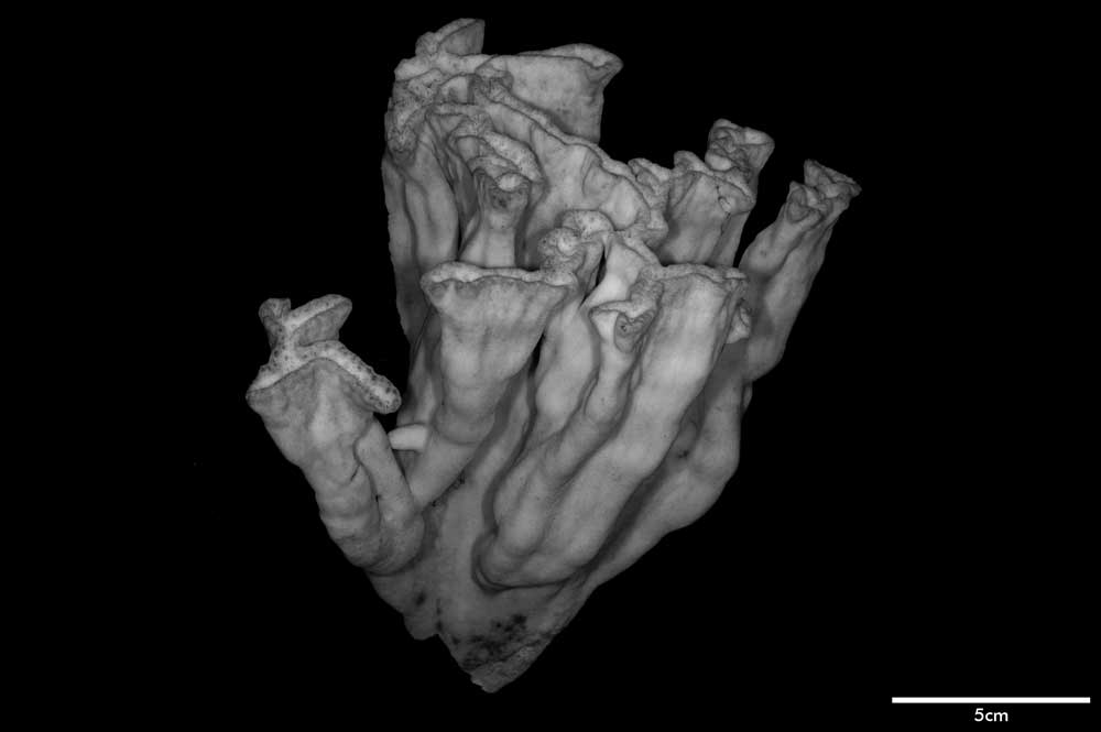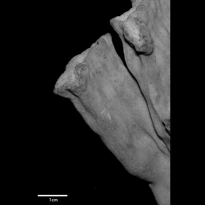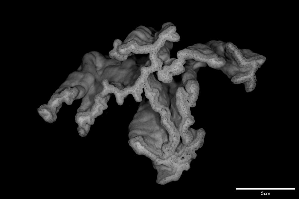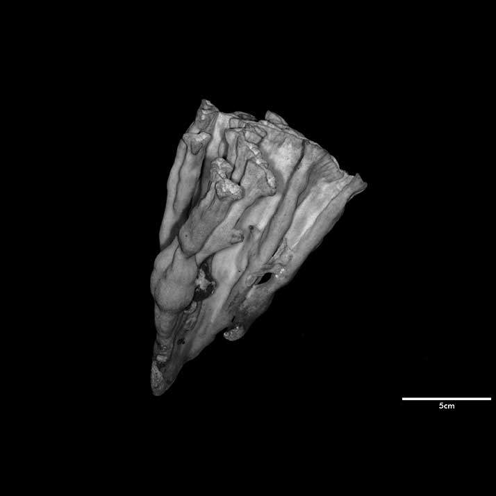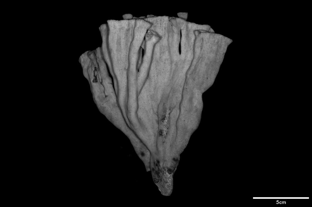 Corallum flabello-phaceloid: living portion 15 cm high (specimen is a fragment of a big colony). Calicular surface confined to narrow region within meandering valleys. Corallum appears to be close fusion of vertical compressed stems reaching common level, sides marked with longitudinal depressions. Individual stem wedged-shaped; one not fully fused: 1 cm across at base, 3.4 cm x 0.7 cm at apex. Non-calicular surface (side of colony) made uneven by low swellings; constricted, surface around 7 mm below apex; above this line of constriction, surface appears shirred; ridge and furrows system well developed with ridges wider than furrows but this relation is reversed near apex; ridges armed with spines in very short rows, either crosswise or oblique in position.