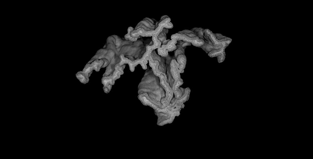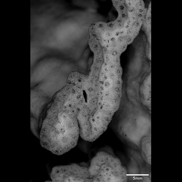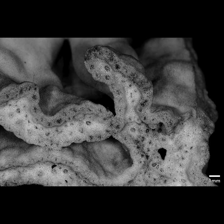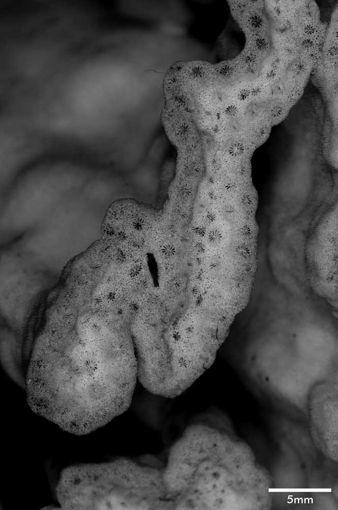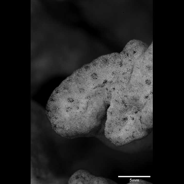 Calicular surface in form of shallow, meandering valleys with irregular width. When branches coalesce their valleys become continuous with dissolution of intervening wall. Calicles form single row at rim; those inside without apparent arrangement; peripheral ones generally wider (little over 1 mm) than interior ones; both slightly protruding. Intercalicinal areas limited in extent, reticulate with round meshes.