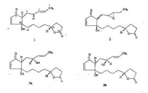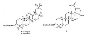 The freeze dried unripe fruit of Achras zapota afforded a mixture of ?-amyrin pentanoate (1a) and a-amyrin pentanoate (1b) in a 2:1 ratio, a mixture of spinasterol (2a) and taraxerol (2b) in a 2.4:1 ratio, and a fatty acid ester of oleanolic acid (3). Their structures were identified by NMR spectroscopy. 3 and sample 1 were tested for antimicrobial activity by the agar cup method. Sample 1 showed moderate activity against the fungus C. albicans and low activity against the fungi A. niger and T. mentagrophytes. 3 exhibited low activity against C. albicans and A. niger, and was inactive against T. mentagrophytes. They were inactive against the bacteria E. coli, P. aeruginosa, S. aureus, and B. subtilis.