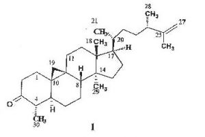 The flowers of Brugmansia suaveolens afforded -carotene, -sitosterol, -stigmasterol, 3 -hydroxyonocera-8(26), 14-dien-21-one, and lansiolic acid by silica gel chromatography. Their structures were identified by comparison of their 1H NMR spectral data with those reported in the literature.