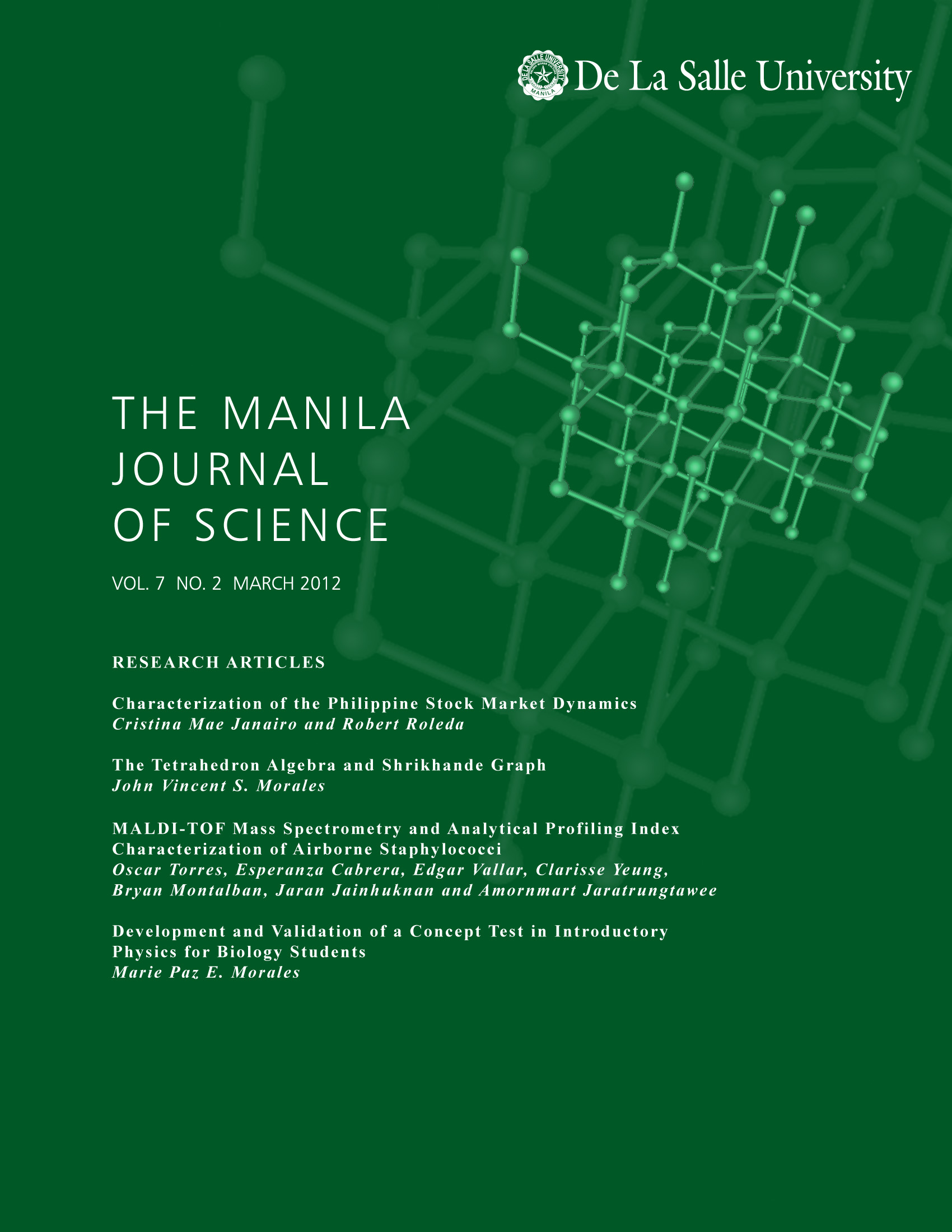 Volume 7, number 2 (2012) Characterization of the Philippine Stock Market Dynamics C. Janairo, R. Roleda (pp. 1-9) The Tetrahedron Algebra and Shrikhande Graph J. Morales (pp. 10-18) MALDI-TOF MASS SPECTROMETRY AND ANALYTICAL PROFILING INDEX CHARACTERIZATION OF AIRBORNE STAPHYLOCOCCI O.Torres, E. Cabrera, E. Vallar, C. Yeung, B. Montalban, J. Jainhuknan, and A. Jaratrungtawee(pp. 19-25) Development and Validation of a Concept Test in Introductory Physics for Biology Students M. Morales (pp. 26-44) OTHER PUBLICATIONS Volume 17 (2025)Volume 16 (2023)Volume 15 (2022)Volume 14 (2021)Volume 13 (2020)Volume 12 (2019)Volume 11 (2018)Volume 10 (2017)Volume 9 (2016)Volume 8 Number 2 (2013)Volume 8 Number 1 (2012)Volume 7 Number 2 (2012)Volume 7 Number 1 (2011)Volume 6 Number 2 (2011)Volume 6 Number 1 (2010)Volume 5 Number 1 (2002)Volume 4 Number 2 (2001)Volume 4 Number 1 (2001)Volume 3 Number 2 (2001)Volume 3 Number 1 (2001)Volume 2 Number 2 (1999)Volume 2 Number 1 (1999)Volume 1 Number 2 (1998)Volume 1 Number 1 (1998)