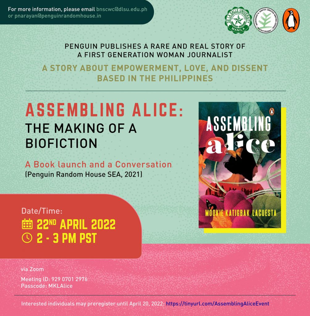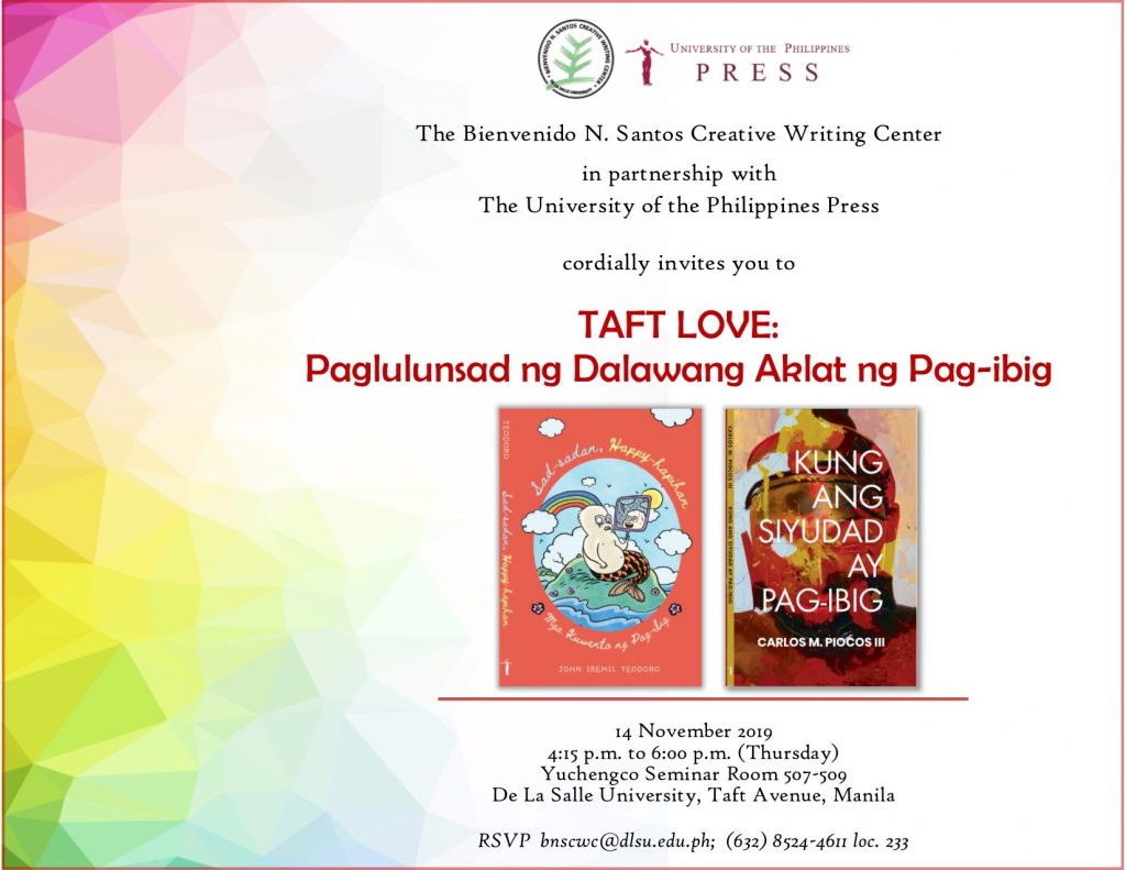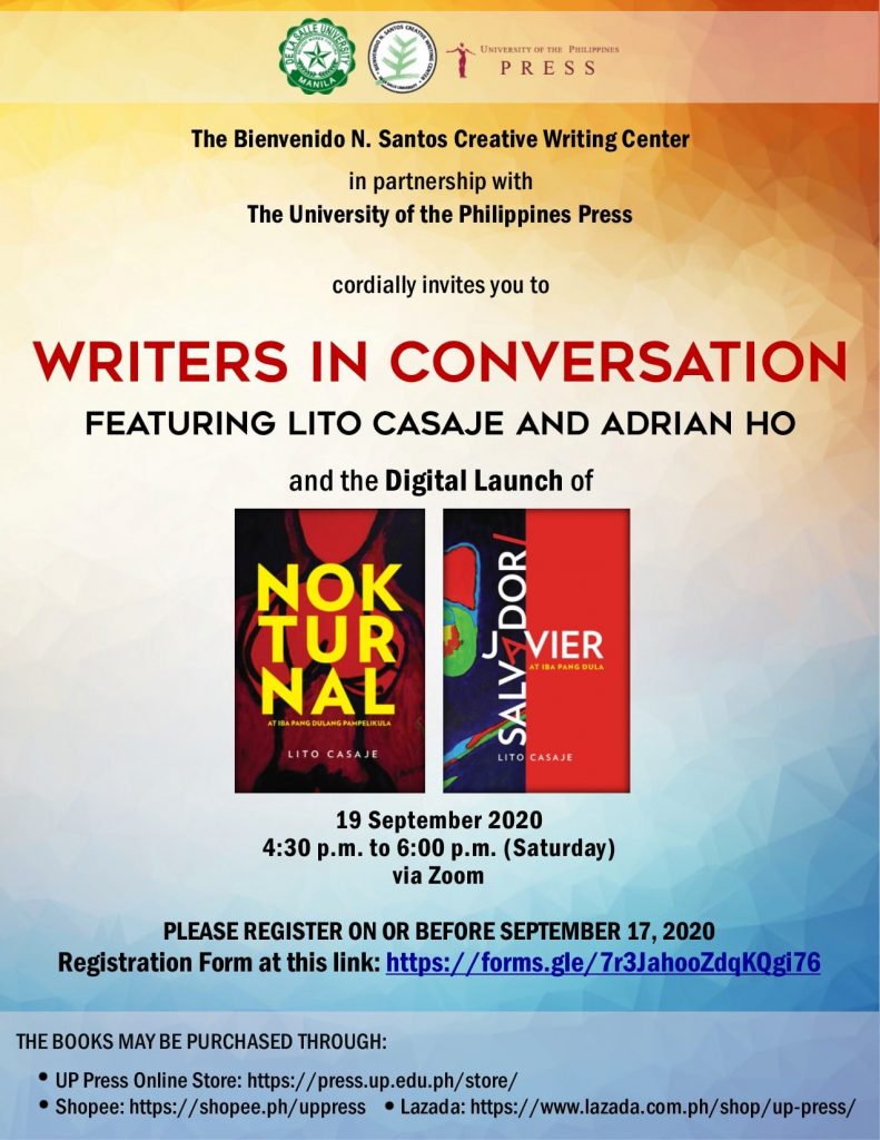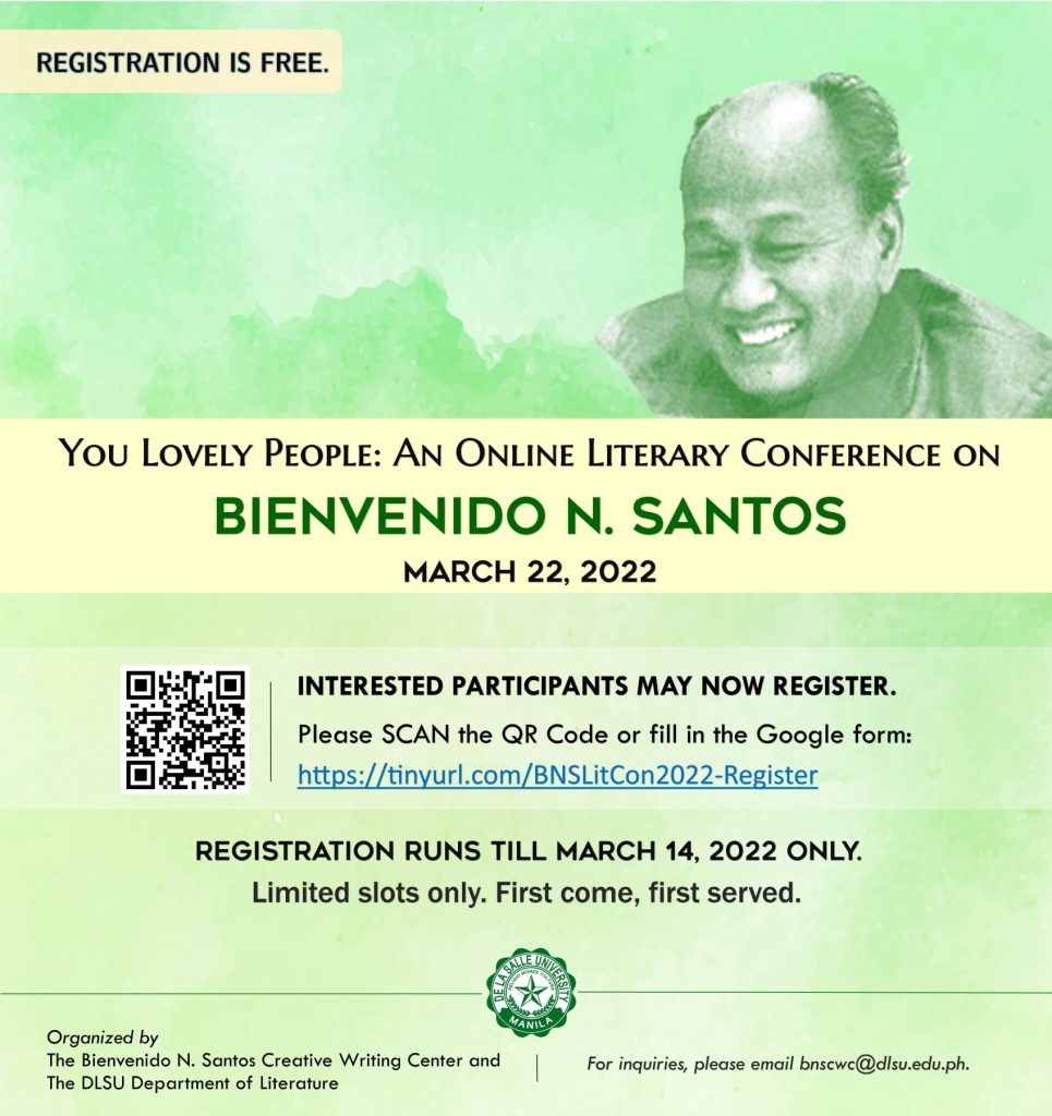 This event is organized by the Bienvenido N. Santos Creative Writing Center in partnership with DLSUPH, OMF Literature Inc., Taftique, Inc., and The Bookmark, Inc.