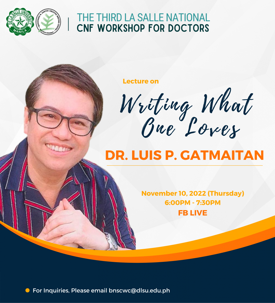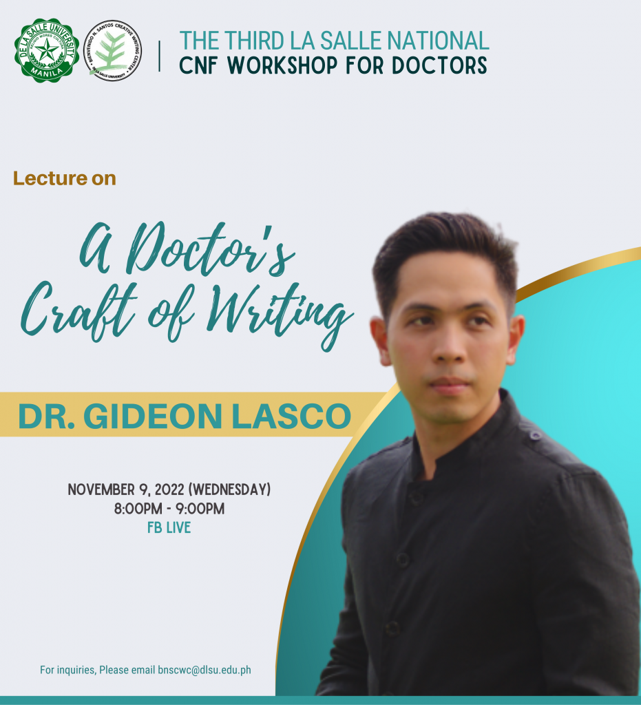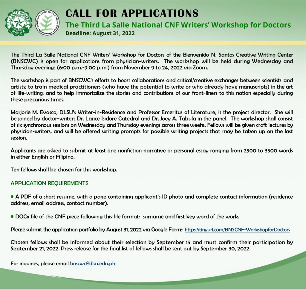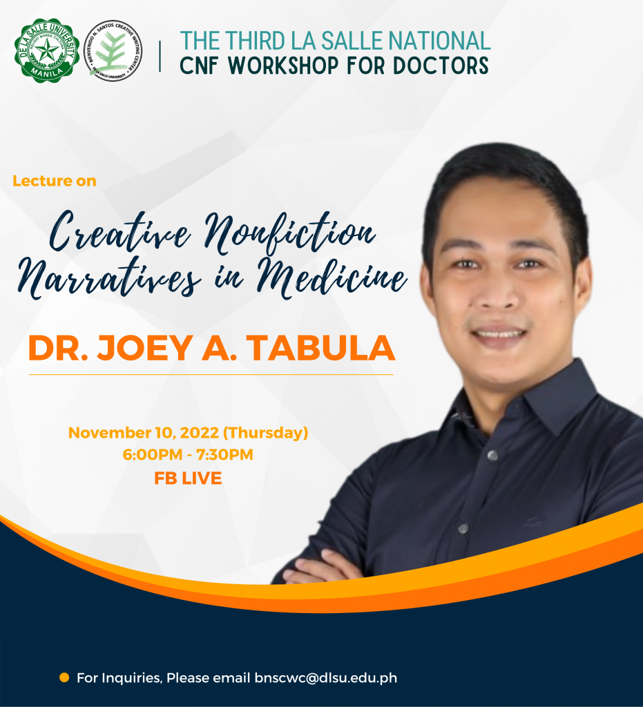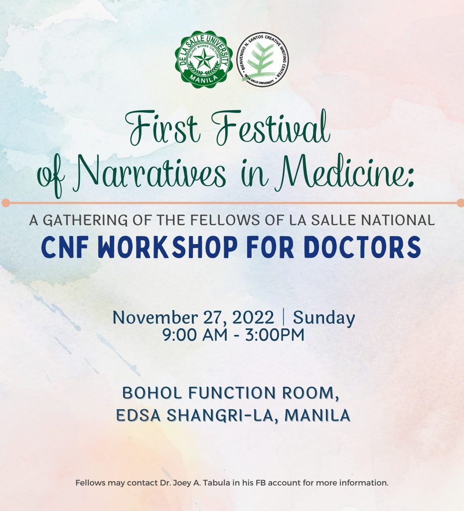 For the first time in three years, Fellows of the 2020, 2021, and 2022 La Salle National CNF Workshops for Doctors will gather in a face-to-face Festival to meet and greet each other, and to celebrate literary harvests. This CNF workshop series for doctors is organized by the Bienvenido N. Santos Creative Writing Center of De La Salle University, under the directorship of Prof. Ronald Baytan in 2020, & Prof. John Iremil Teodoro in 2022.
