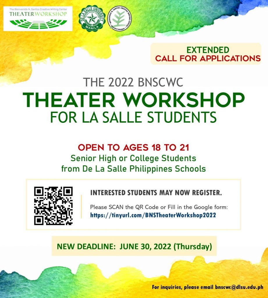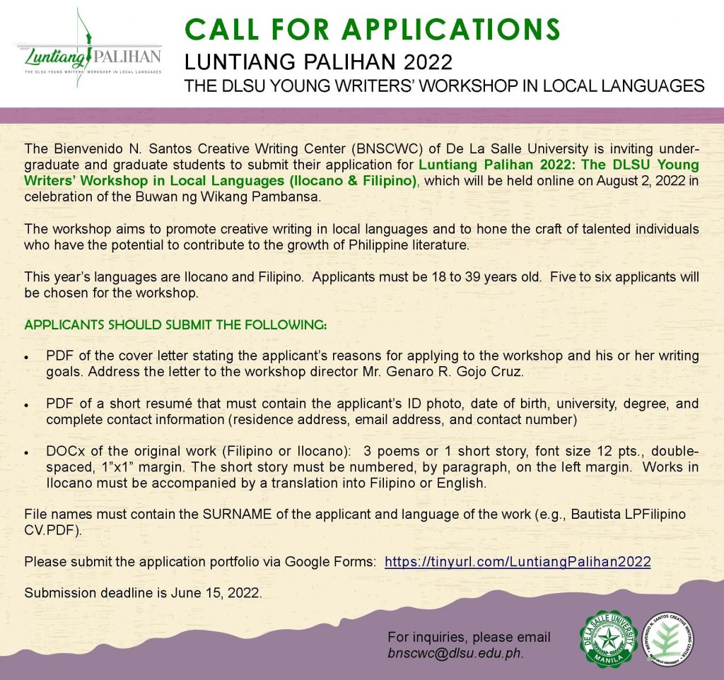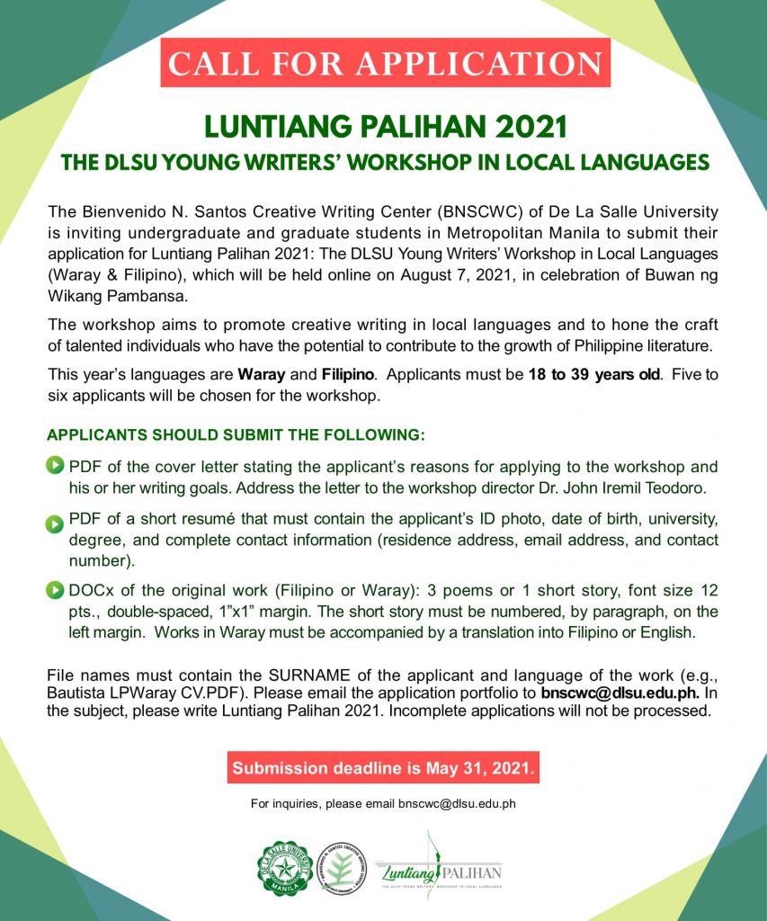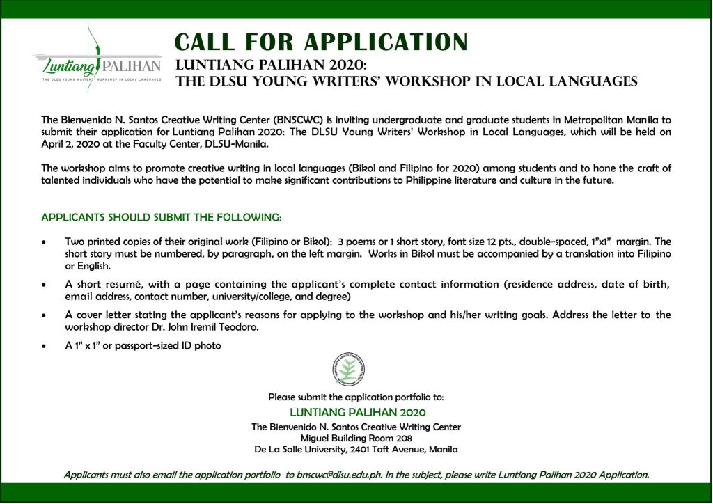 The Bienvenido N. Santos Creative Writing Center is inviting undergraduate and graduate students in Metro Manila to submit their application to Luntiang Palihan 2019: The DLSU Young Writers’ Workshop in Local Languages, which will be held on April 10, 2019 at the Faculty Center, DLSU-Manila.
