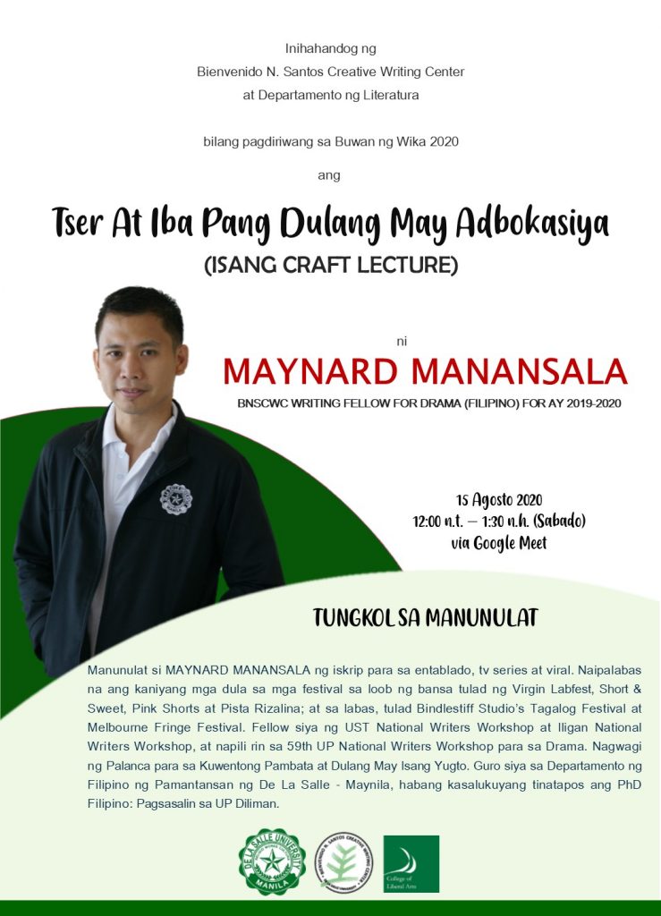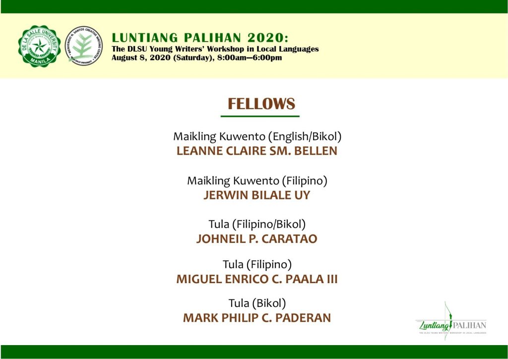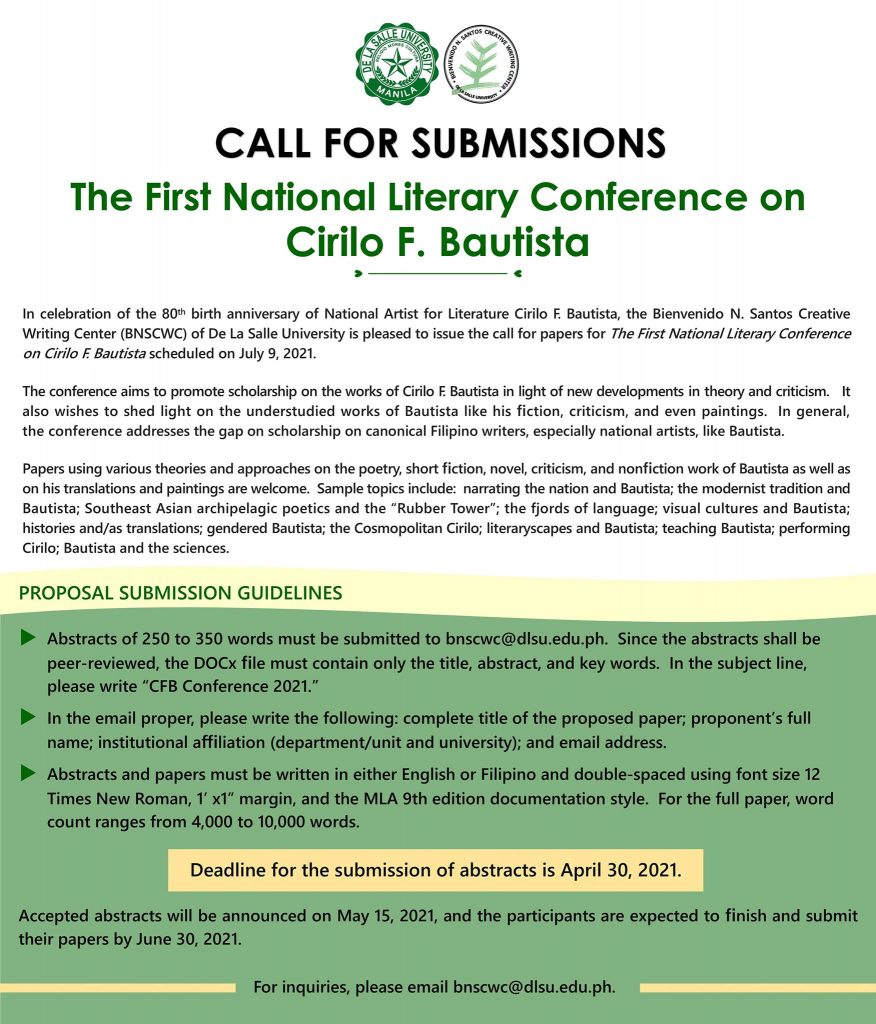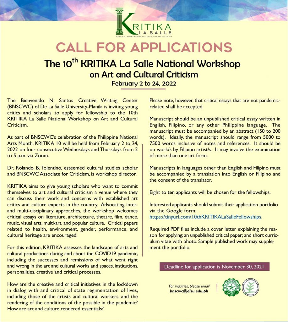 This grant program is a project of the College of Liberal Arts’ Research and Advanced Studies Office with support from the Bienvenido N. Santos Creative Writing Center and the DLSU Office of the Vice Chancellor for Research and Innovation.