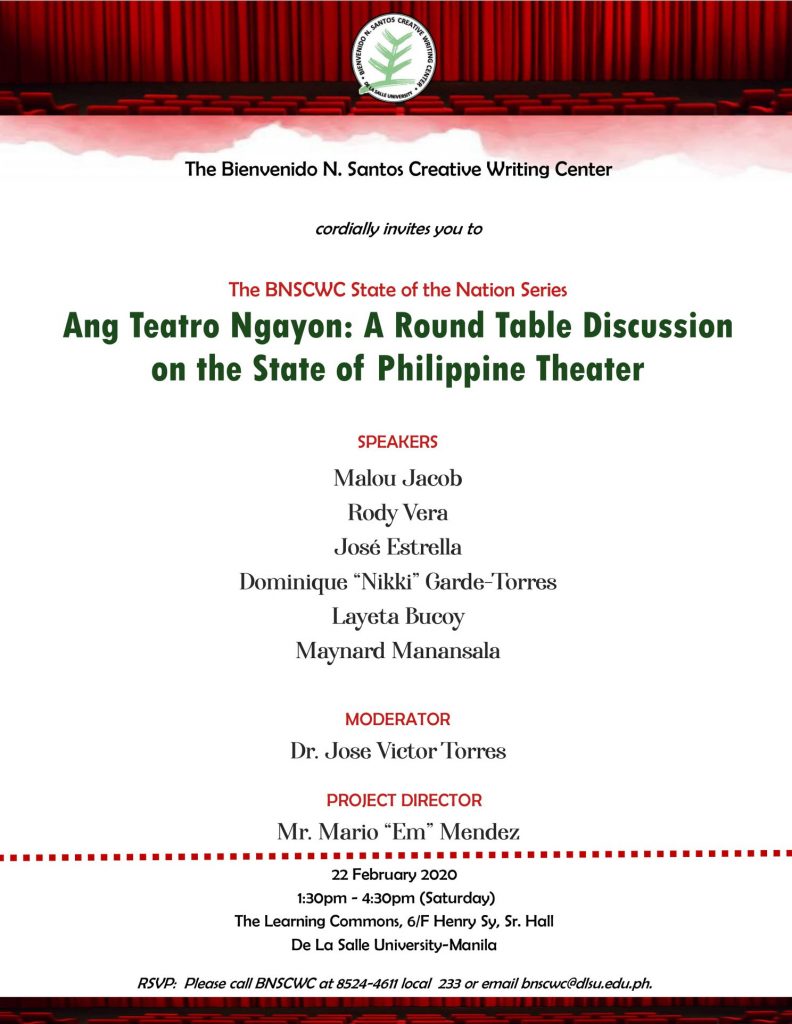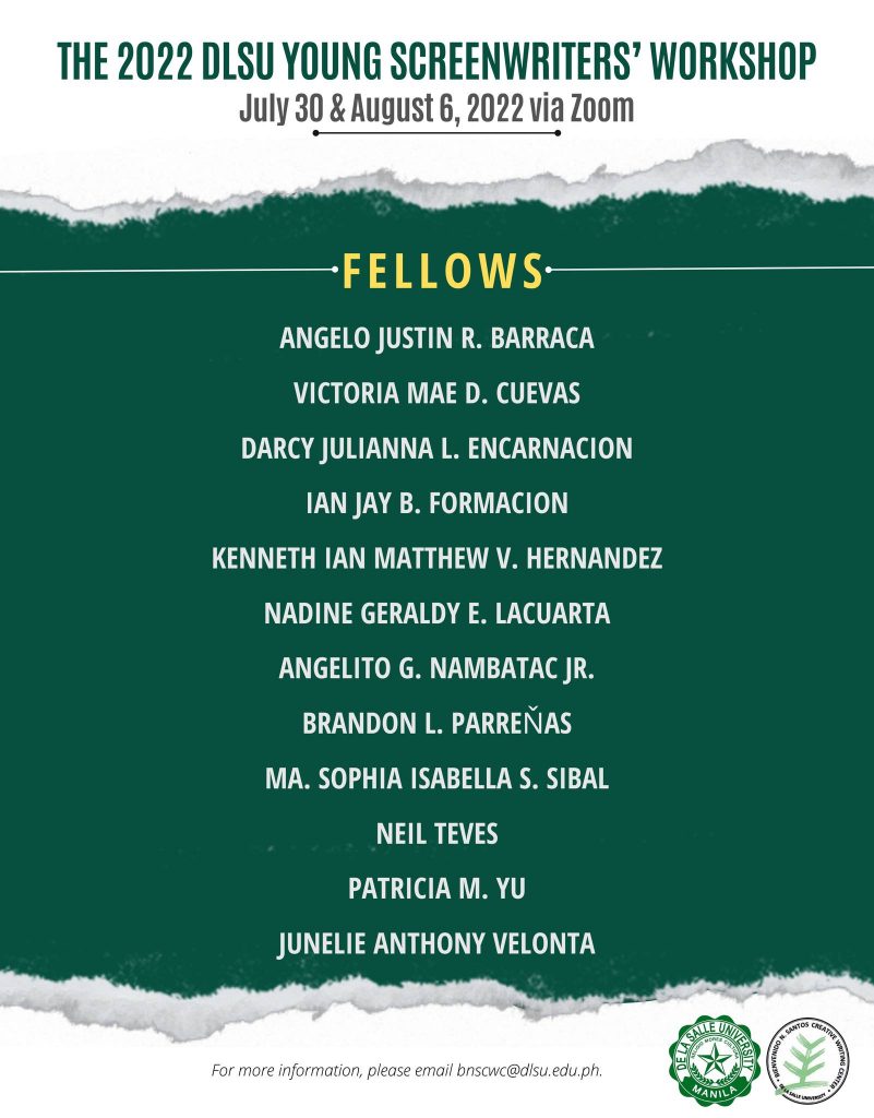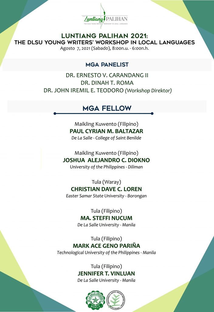 Rolando B. Tolentino, associate for criticism of DLSU Bienvenido N. Santos Creative Writing Center, is workshop director. He is supported by a distinguished panel of experts: art critic and artist Cid Reyes; critic and poet Shirley O. Lua, historian and dramatist Jose Victor Z. Torres; and critic and poet Carlos M. Piocos III.