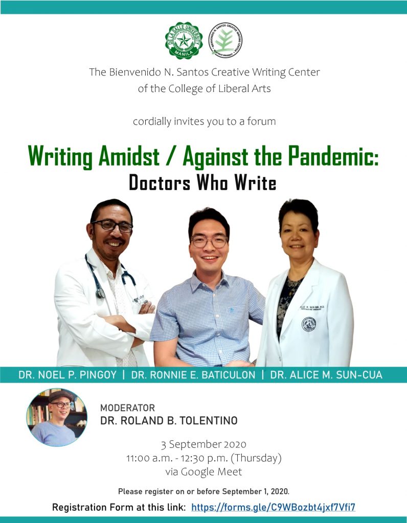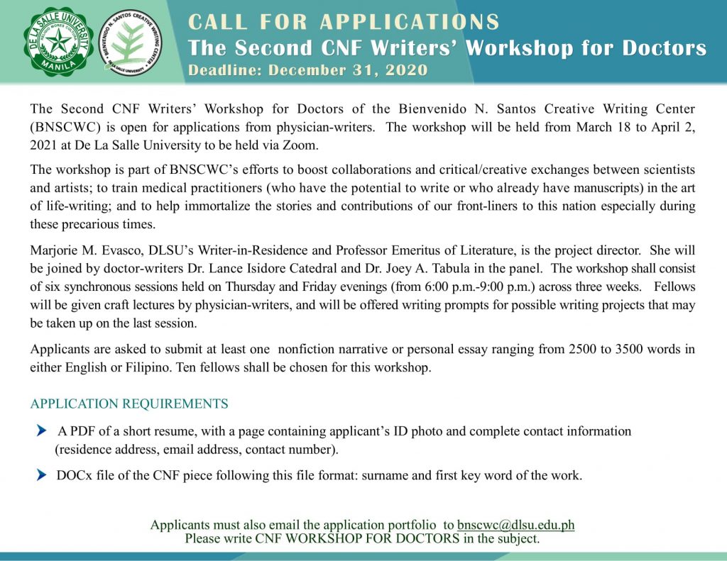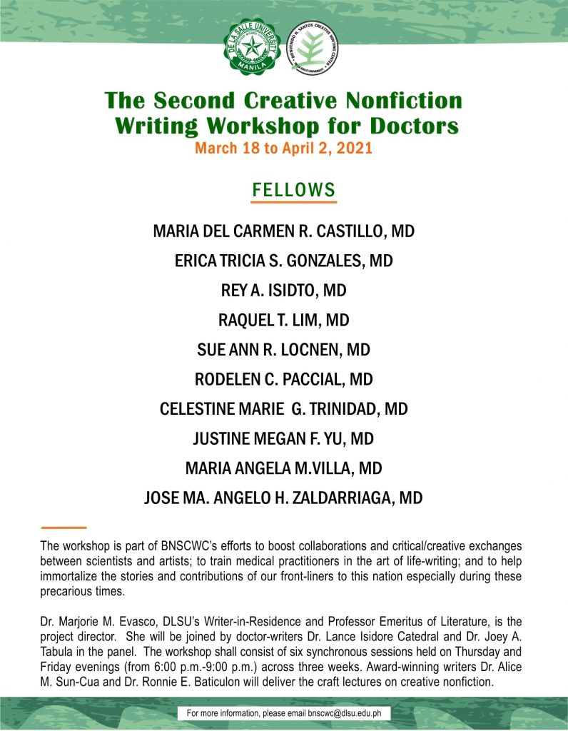 The past three workshops were directed by Prof. Marjorie Evasco, DLSU Writer-in-Residence & Professor Emeritus of Literature, with co-panelists Dr. Joey A. Tabula & Dr. Lance Catedral. Physician-writers who have given craft lectures in the workshops were: Drs. Ron Baticulon, Alice Sun-Cua, Gideon Lasco, & Luis Gatmaitan.