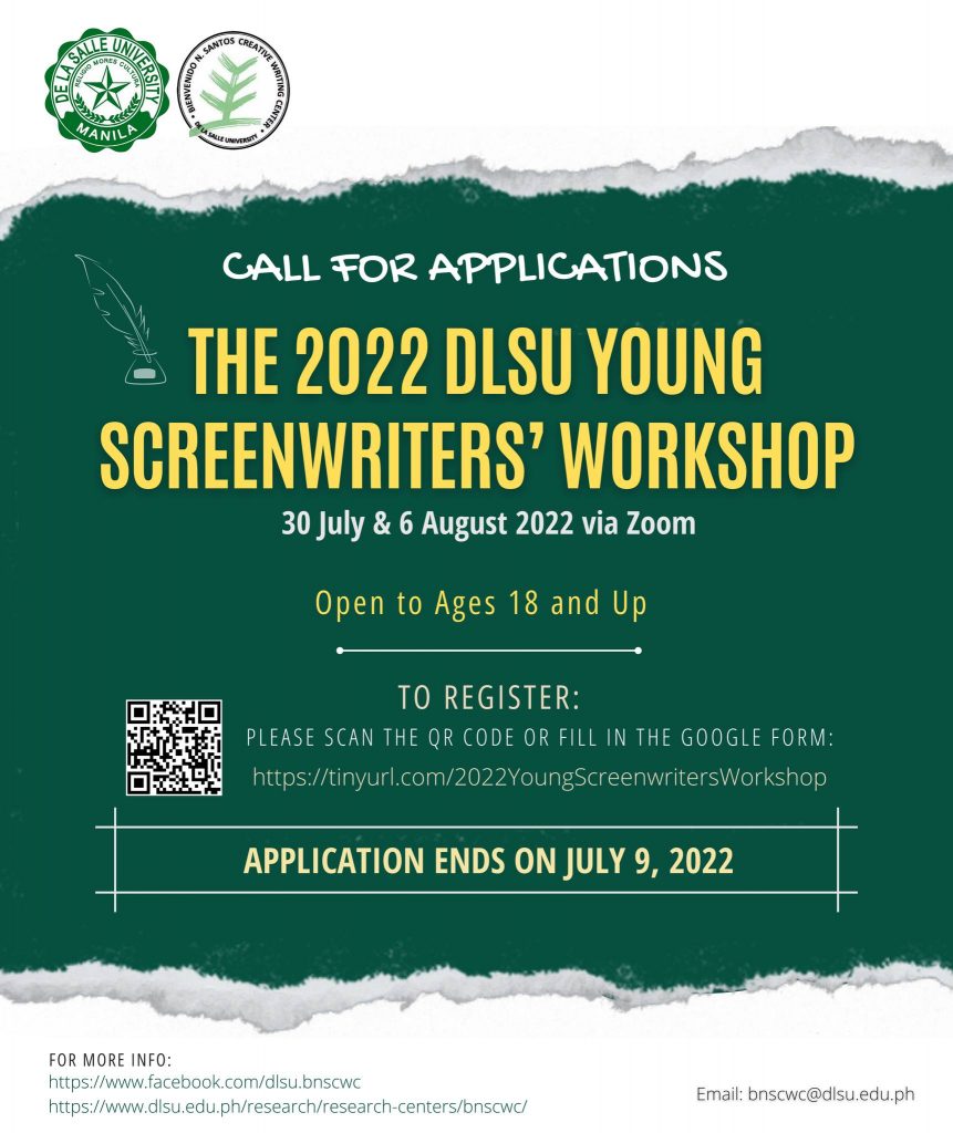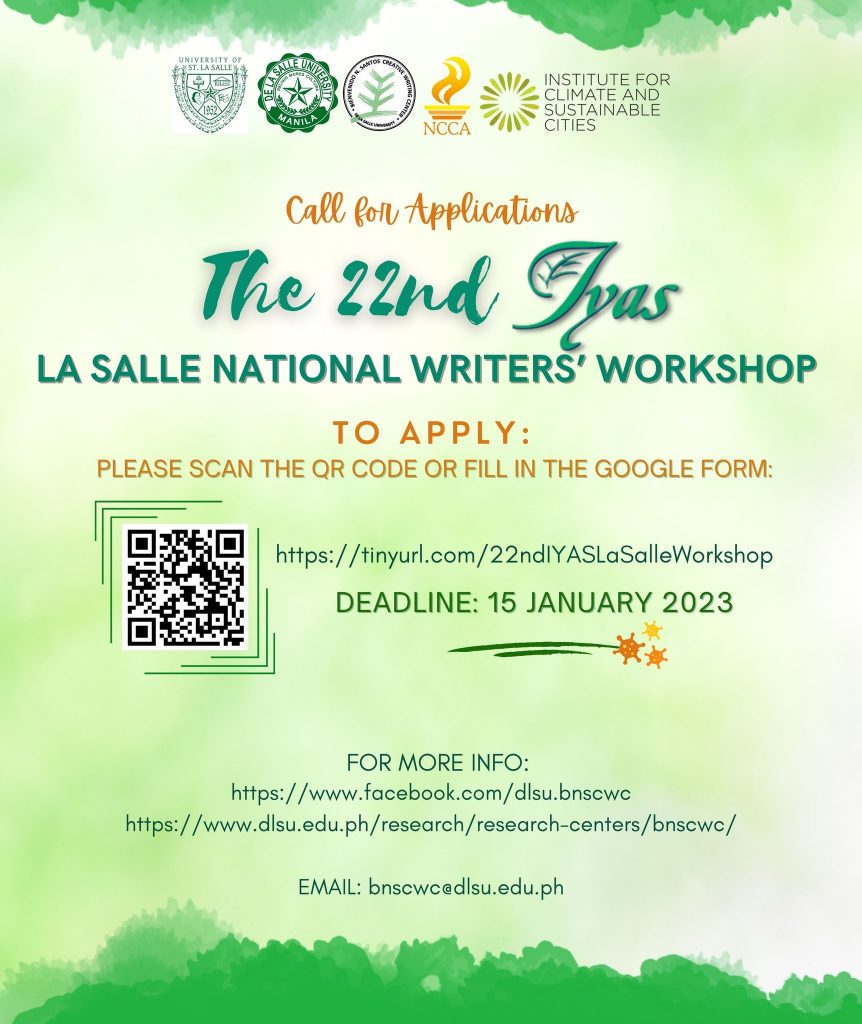 The 22nd IYAS La Salle National Writers’ Workshop is open for applications. It will be held online from April 26 to May 18, 2023 on Wednesday and Thursday afternoons across four weeks.