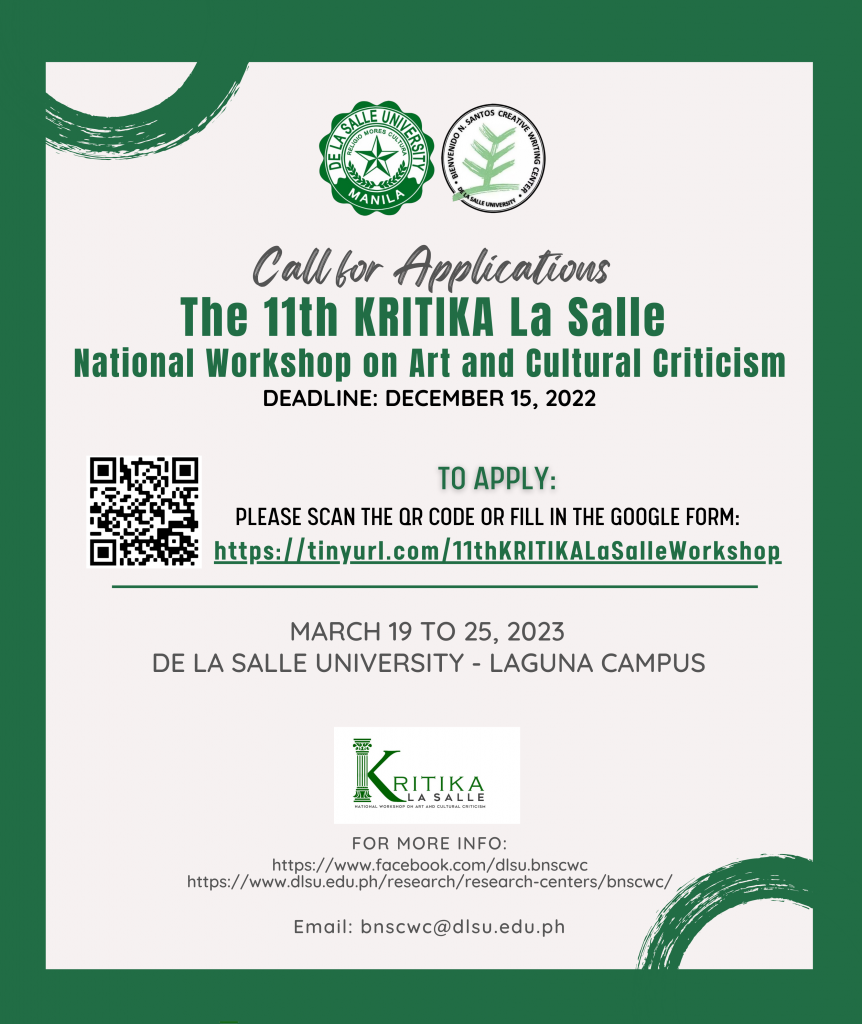 KRITIKA is organized by the Bienvenido N. Santos Creative Writing Center and is supported by the DLSU Angelo King Institute for Economics and Business Studies and the DLSU Office of the Vice Chancellor for Research and Innovation.