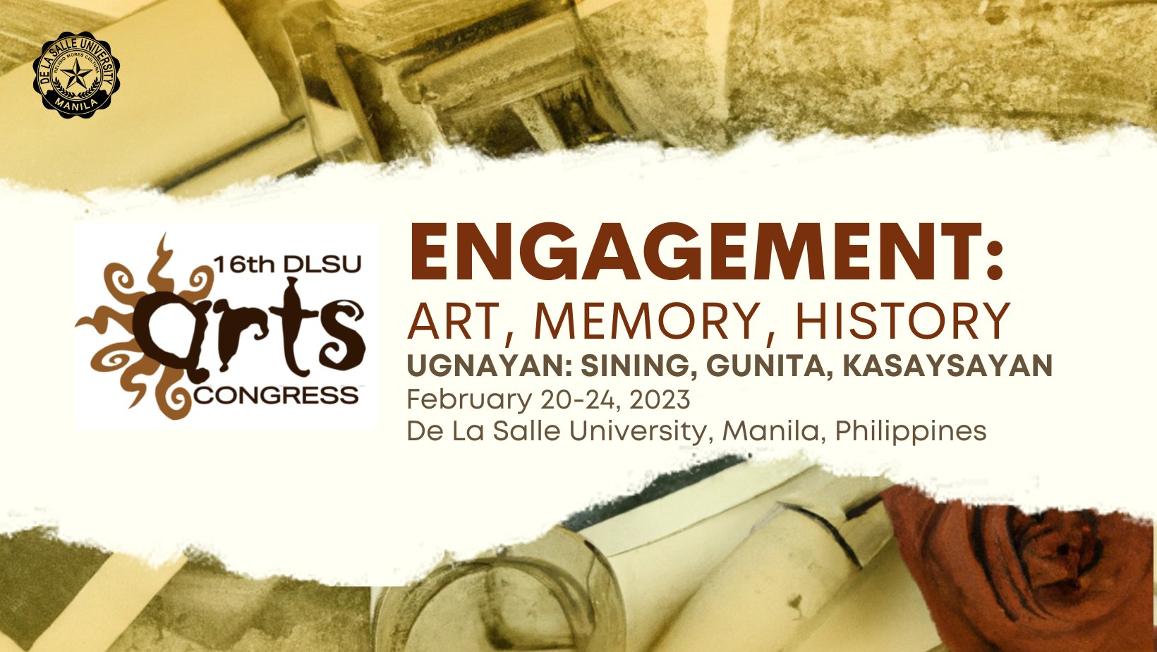 The 16th DLSU Arts Congress (DAC) is organized by the DLSU College of Liberal Arts (DLSU CLA), College of Computer Studies (CCS), Cultural Arts Office (CAO), The Museum, The Libraries, and the CLA Graduate Student Council (CLA GSC), with the support of the Office of the Vice President for Research and Innovation (VPRI) and the Office of the External Relations. The organizing team includes the Department of Literature, the Department of Filipino, Southeast Asian Research Hub and Center (SEARCH), Bienvenido N. Santos Creative Writing Center (BNSCWC), and the Research and Grant Management Office (RMGO). For inquiries, please email [email protected].