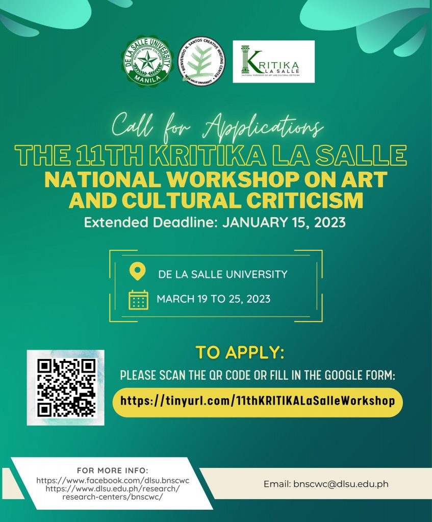 Para sa mga humingi ng extension, malugod naming ipinapaalam sa inyo na na-extend ang deadline ng pagpasa ng aplikasyon sa KRITIKA Workshop.
