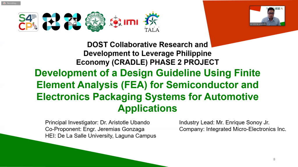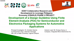 The successful launching of the Thermomechanical Analysis  laboratory (TALA)  was made last Feb 21, 2020 at the Laguna Campus of De La Salle University for the DOST Cradle Project – Development of a Design Guideline Using Finite Element Analysis for Semiconductor Packages  . The launching was an intimate gathering of the stakeholders from the funding agency, DOST; the industry partner, IMI; the research partner, DLSU and the engineering consultants.