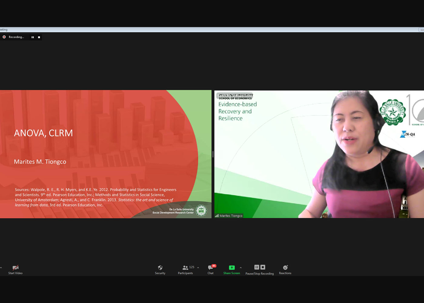 Making abstract concepts come alive through very familiar examples is a skill the Social Development Research Center regularly delivers to its audiences. This was once again evident in the Webinar Training on Statistics for the Social Sciences conducted on November 20 via Zoom, with DLSU School of Economics Dean Dr. Marites Tiongco sharing her expertise as its resource person. Participated in by 127 attendees, mostly from academe, NGOs and government agencies, the three-hour webinar lecture/demonstration examined the topics of probability, statistics and economics, which were demonstrated through the use of MS Excel.