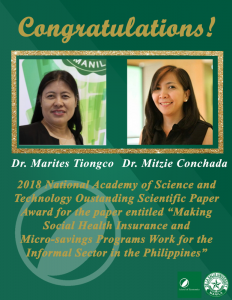 The National Academy of Science and Technology awarded Dr. Marites Tiongco and Dr. Mitzie Irene Conchada with the Outstanding Scientific Paper Award for their paper entitled “Making Social Health Insurance and Micro-savings Programs Work for the Informal Sector in the Philippines” published in the DLSU Business and Economics Review.