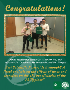 In addition, undergraduate students Mr. Ralph Go, Mr. Nikita Magbitang, and Mr. Alexander Wu received the Best Scientific Poster Award for their work entitled “Is it enough? A fiscal analysis on the effects of taxes and transfers on the 4Ps beneficiaries of the Philippines” which was completed under the advisement of Dr. Mitzie Irene Conchada, Dr. Arlene Inocencio and Dr. Marites Tiongco.