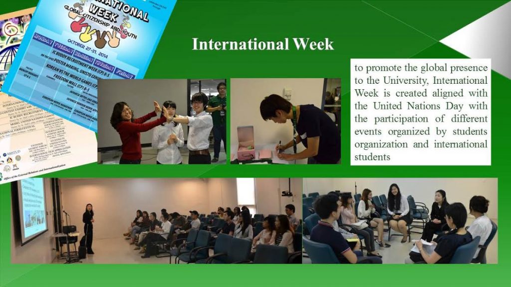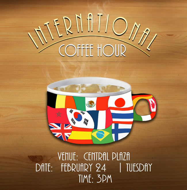 to gather both international students (IS) and Filipinos on campus. It is an opportunity for IS to interact with University administrators for a meet-and-greet! Each Coffee Hour gathering is celebrated with a cultural theme (Cambodian, French, Indonesian, American culture, and the like) to expose IS and Filipinos alike to the diversity of culture on campus. IS who are performing well academically are also recognized during the event.
