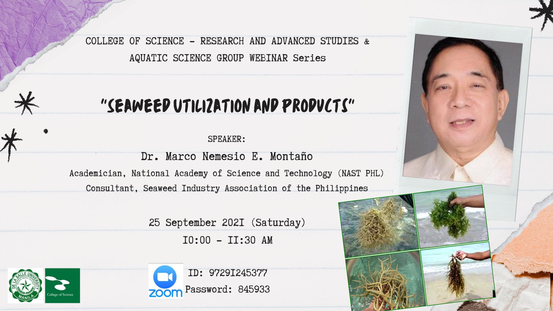 The DLSU COS – Research and Advanced Studies and the Aquatic Science group invited Dr. Marco Nemesio E. Montaño, Consultant for the Seaweed Industry Association of the Philippines and Academician at the National Academy of Science and Technology to speak at the virtual seminar entitled “Seaweed Utilization and Products” to discuss the various ways to utilize seaweed in the Philippines.